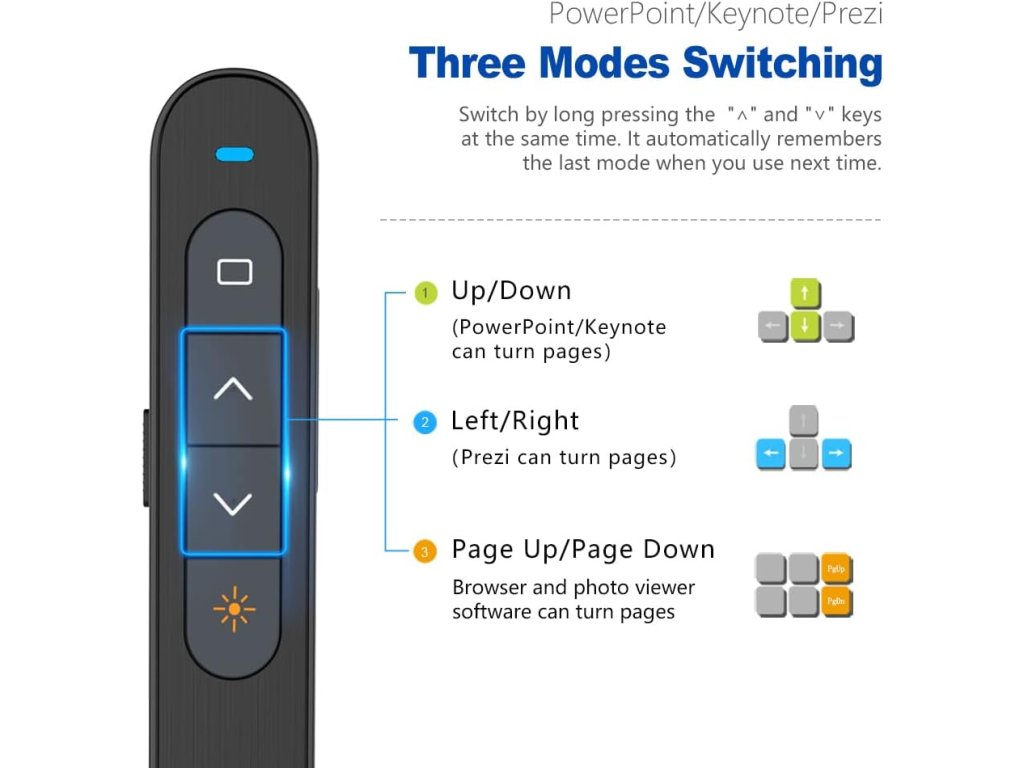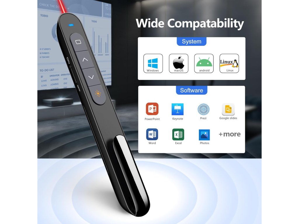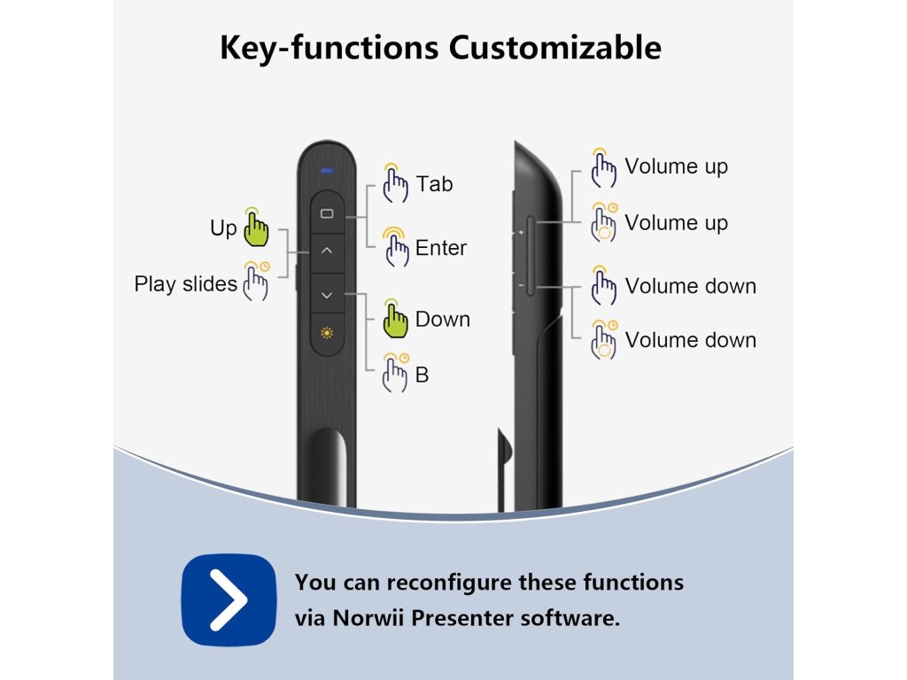 Bezdrátový prezentační ovladač Norwii N27 je ideálním pomocníkem pro vaše prezentace. Nabízí jasné červené laserové ukazovátko (nedoporučuje se pro LCD/LED TV), dosah až 100 metrů a pokročilé funkce jako ovládání hlasitosti a otevírání hyperlinků v PowerPointu. Tlačítka si můžete přizpůsobit pomocí softwaru Norwii Presenter. Je Plug & Play kompatibilní s Windows, macOS, Android a Linux a s prezentačními programy jako PowerPoint, Keynote a Google Slides. Podporuje ovládání více zařízení jedním ovladačem i naopak.
