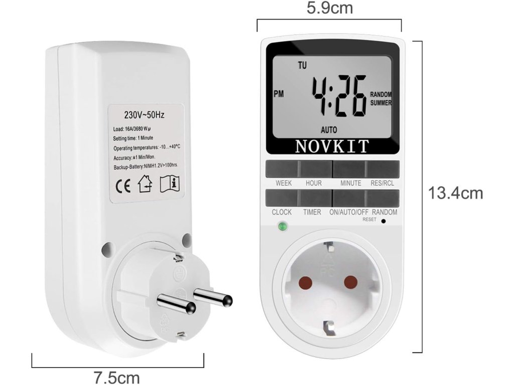 Šetřete energii a automatizujte svou domácnost s digitálními spínacími hodinami NOVKIT do zásuvky. Tyto praktické časovače s německou zásuvkou i zástrčkou vám umožní snadno a rychle programovat automatické zapínání a vypínání domácích spotřebičů, čímž snížíte spotřebu energie a účty za elektřinu.