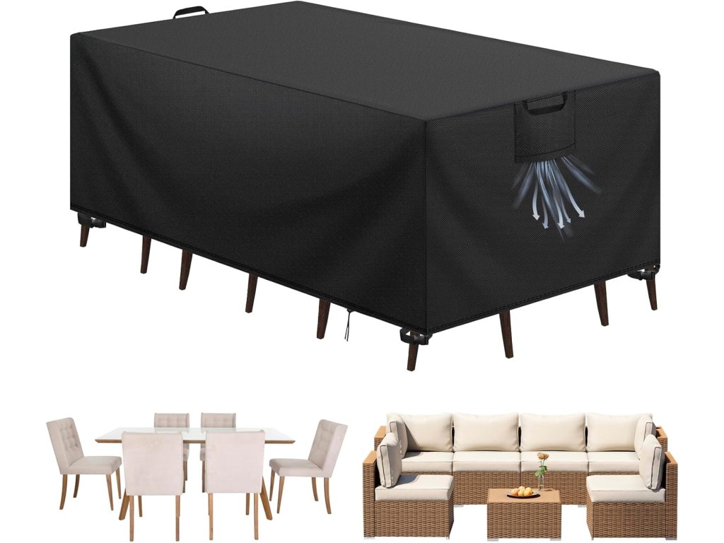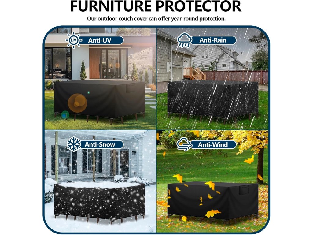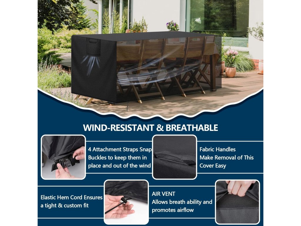 Konstrukce plachty obsahuje inovativní ventilační otvory se zvětšeným nasávacím otvorem, které maximalizují proudění vzduchu. Tento systém účinně snižuje vnitřní kondenzaci vlhkosti a zabraňuje vzniku plísní a nepříjemných pachů, čímž udržuje nábytek i polstrování v suchu. Pro zajištění stability ve větrném počasí je plachta vybavena dvojitým upevňovacím systémem: nastavitelnou elastickou šňůrkou ve spodní části a bezpečnostními přezkami v rozركh čtyřech rozích, které se upevňují přímo k nohám nábytku.