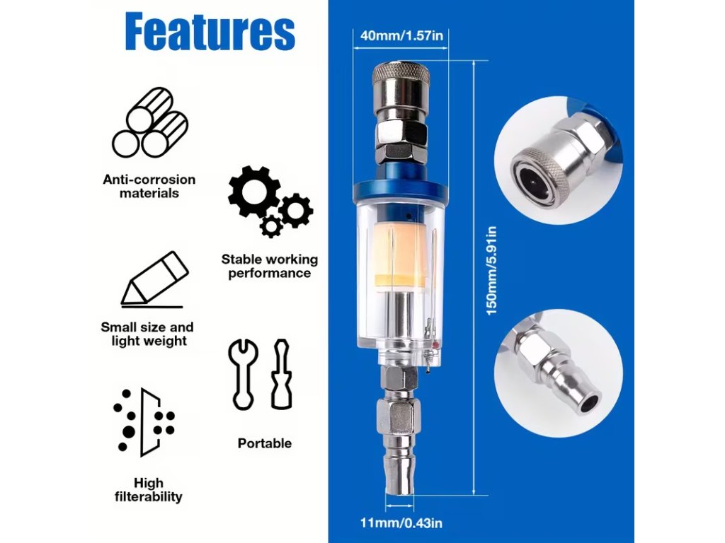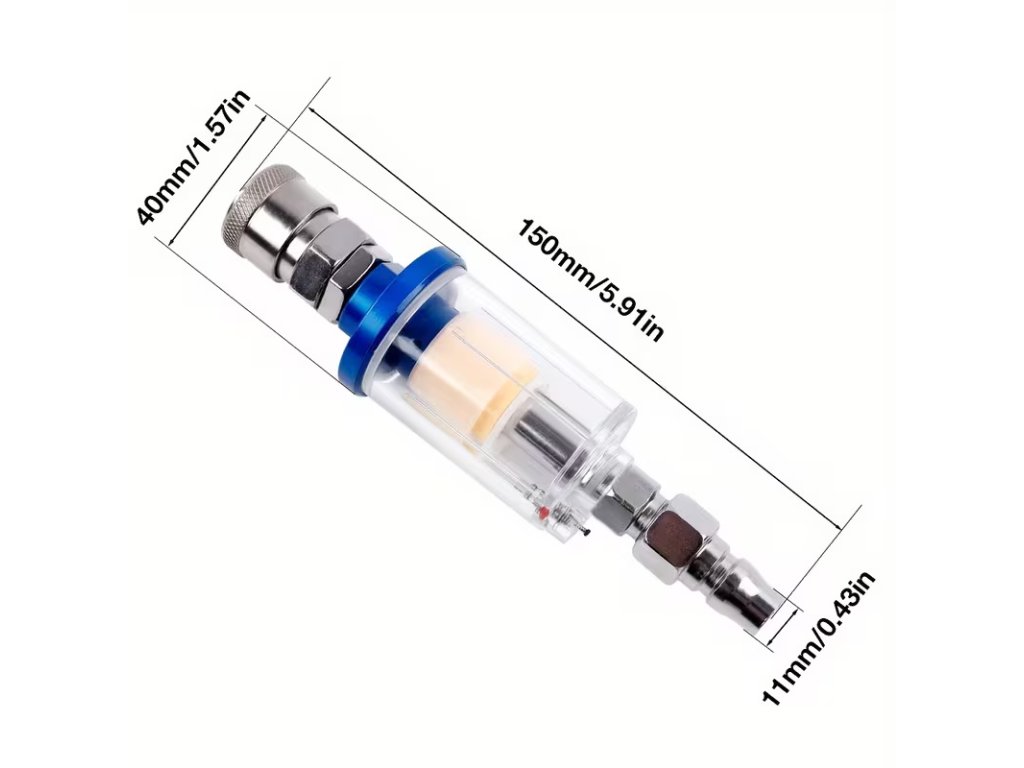 Konstrukce filtru je navržena pro snadné sledování stavu znečištění díky průhlednému tělu. Spodní část je vybavena vypouštěcím ventilem, který umožňuje rychlé a jednoduché odstranění nahromaděné vody bez nutnosti demontáže celého filtru. Standardizovaný 1/4 palcový závit zajišťuje širokou kompatibilitu s běžnými typy vzduchových hadic, kompresorů a stříkacích pistolí.