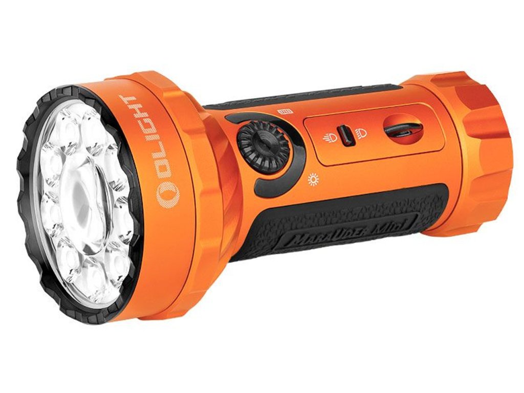 Olight Marauder Mini v oranžové barvě je kompaktní, ale výkonná dobíjecí LED svítilna s duálním paprskem, kombinujícím široký světlomet a dálkový reflektor. Světlomet využívá 9 LED diod a nabízí sedm úrovní jasu v rozsahu 200 až 7000 lumenů. Centrální velká kulatá LED poskytuje silný reflektorový paprsek s dosvitem až 600 metrů. Kolem konvergující čočky jsou rovnoměrně rozmístěny tři RGB barevné LED diody pro všestranné použití.