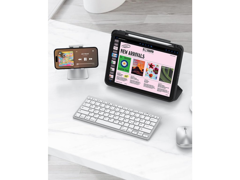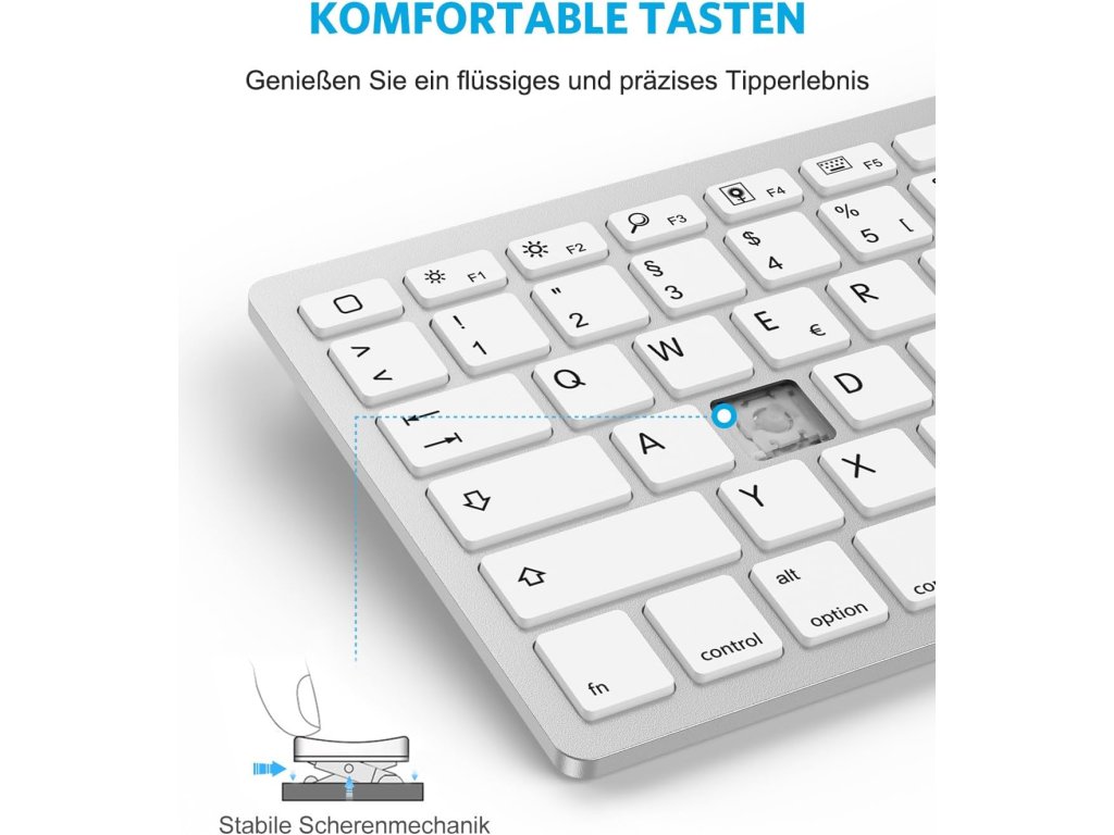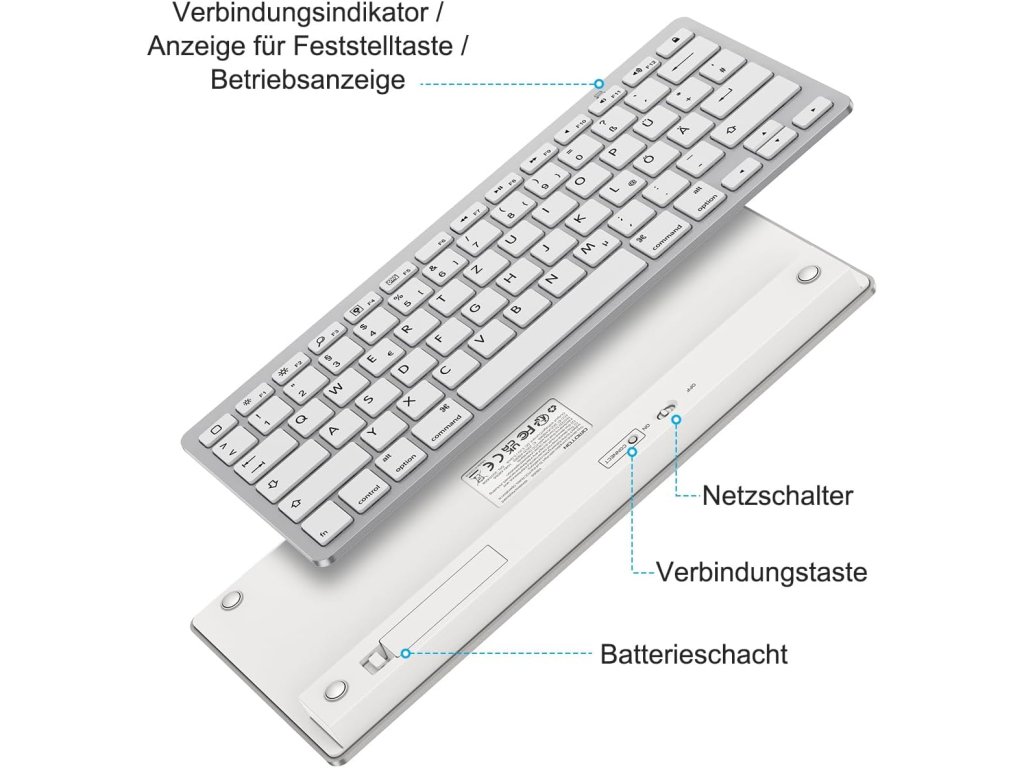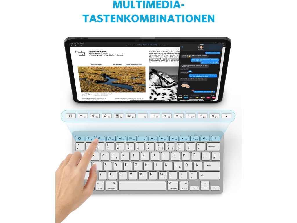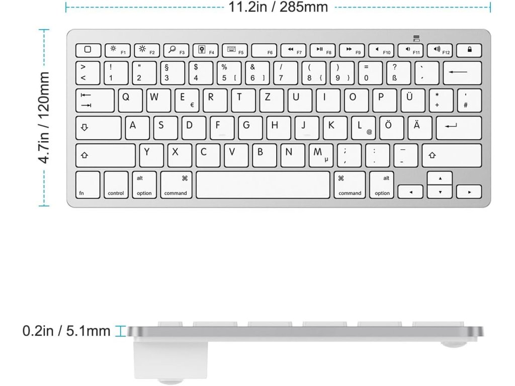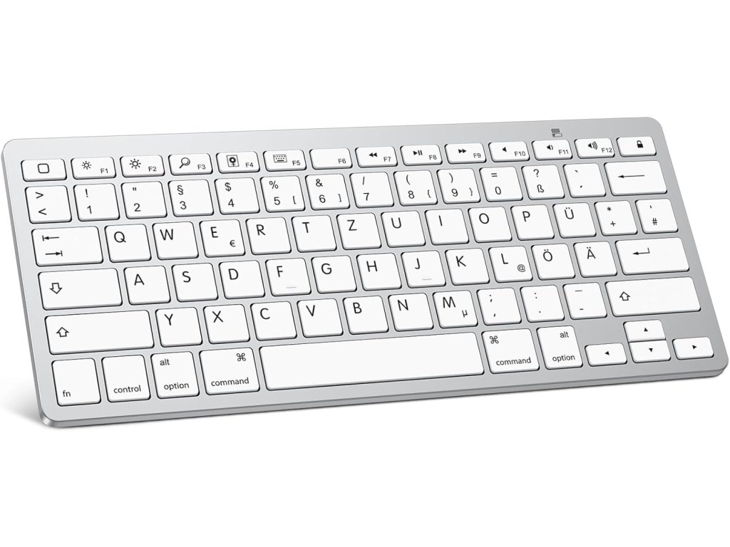 Bezdrátová Bluetooth klávesnice OMOTON s německým rozložením QWERTZ je ideálním společníkem pro váš iPad (včetně nejnovějších modelů jako iPad 10.9", iPad Air 6 a iPad Pro 13") a iPhone. Poskytuje pohodlné psaní až do vzdálenosti 10 metrů. Je kompatibilní s širokou škálou zařízení Apple. Funkční tlačítka umožňují rychlý přístup k médiím, webovým stránkám, ovládání hlasitosti a přehrávání hudby. Kompaktní design šetří místo a zároveň nabízí dostatečný komfort pro psaní na cestách i doma.