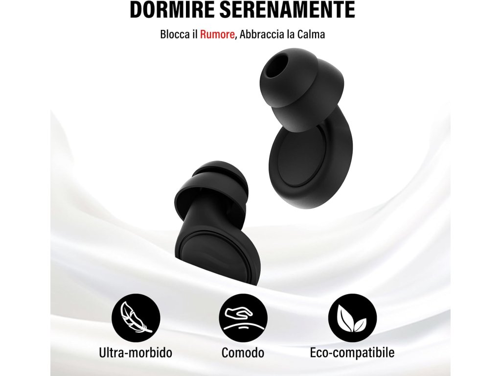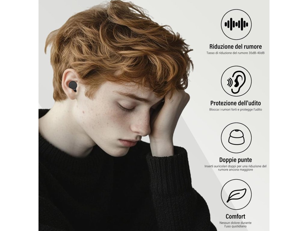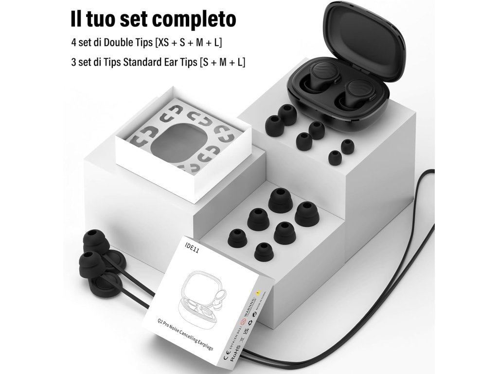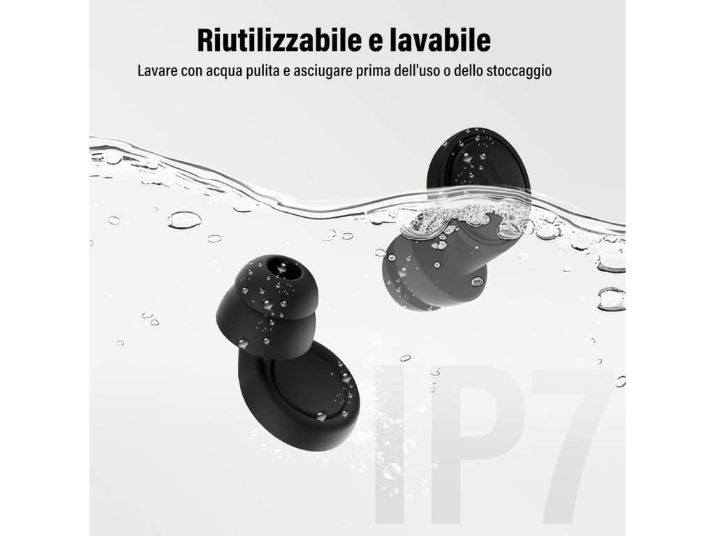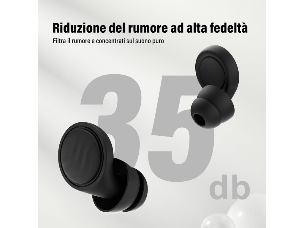 Sada obsahuje 7 párů silikonových špuntů do uší ve čtyřech velikostech (XS, S, M, L), které účinně snižují hluk až o 35 dB. Jsou vyrobeny z lehkého a pružného silikonu a navrženy tak, aby pohodlně seděly v uších i při dlouhodobém nošení. Špunty jsou ideální pro spaní, cestování, práci nebo pro relaxaci v hlučném prostředí. Součástí balení je také stylové pouzdro a šňůrka proti ztrátě.
