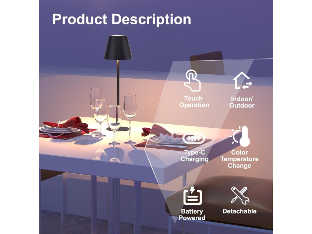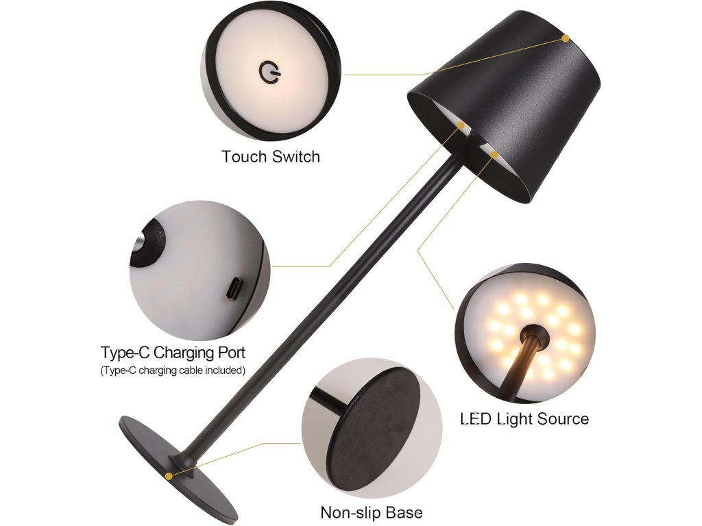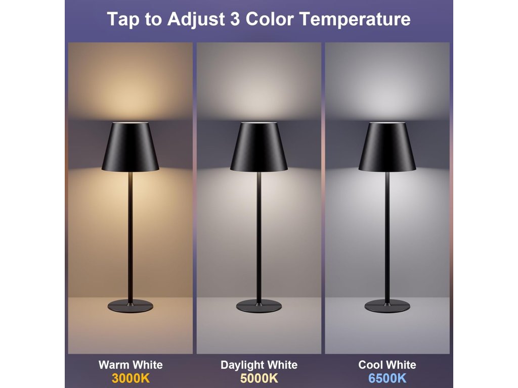 Tato bezdrátová stolní lampa ORALUCE nabízí flexibilní osvětlení pro různé příležitosti. Díky vestavěné 2600mAh nabíjecí baterii poskytuje 8 až 12 hodin nepřetržitého světla a lze ji snadno nabíjet pomocí USB-C kabelu. Po odpojení kabelu je plně přenosná a můžete ji umístit kamkoliv potřebujete. Jednoduchým dotykem si můžete vybrat ze tří barevných teplot světla: teplá bílá (3000K), neutrální bílá (5000K) nebo studená bílá (6500K).