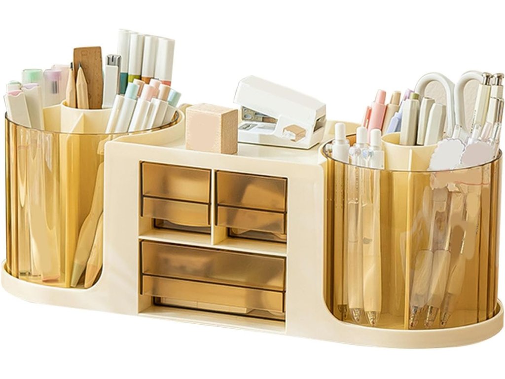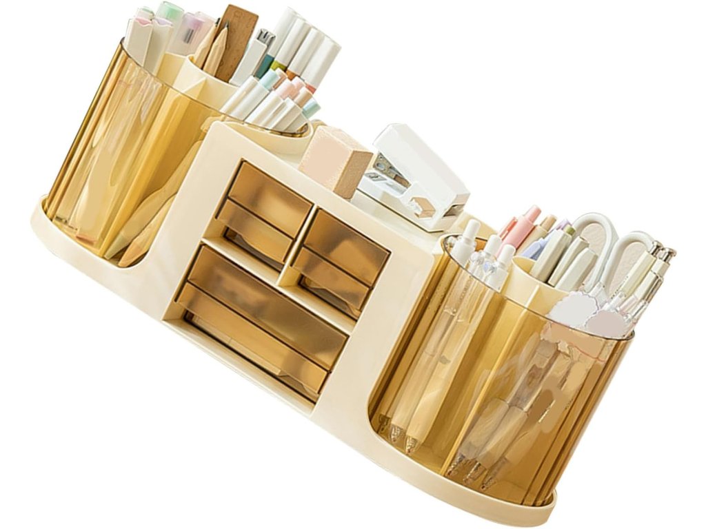 Žlutý otočný držák na tužky a pera o 360° s 2 držáky a zásuvkou. Plastový organizér na psací stůl pro kancelářské a školní potřeby.