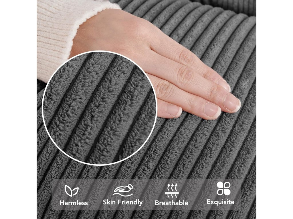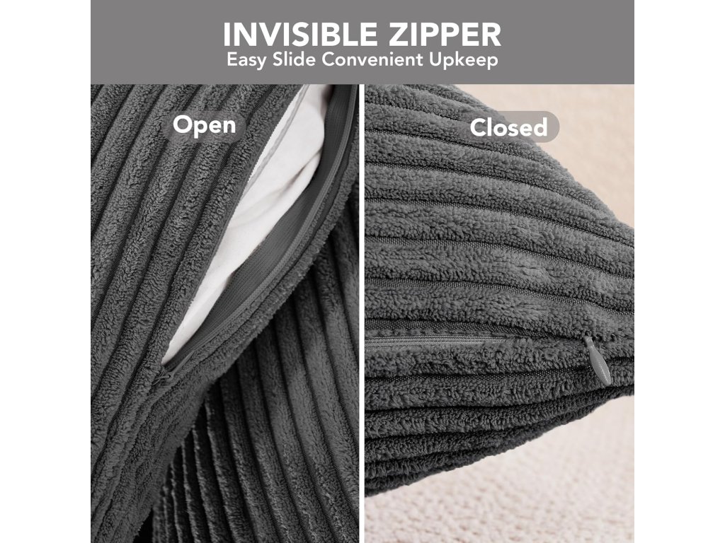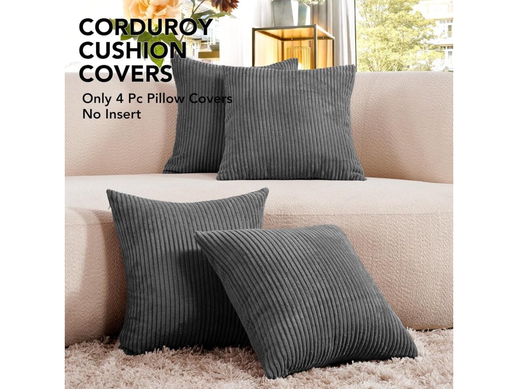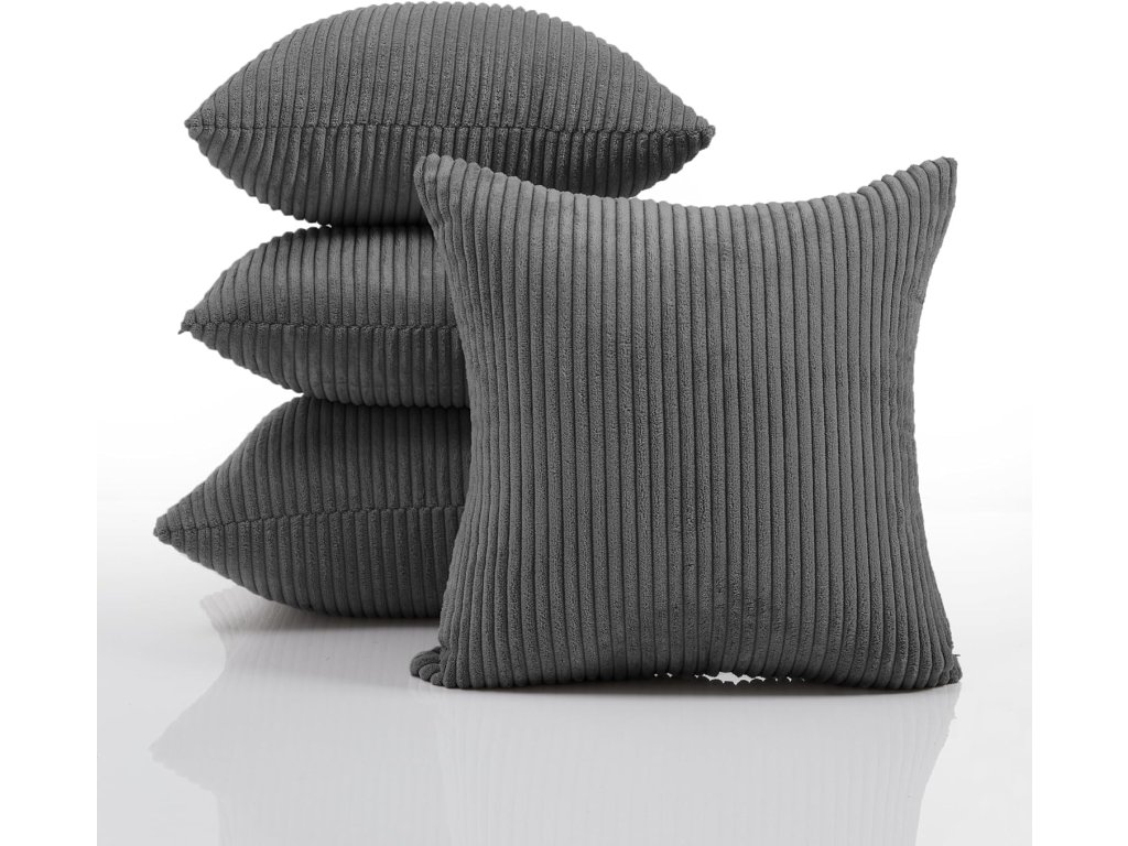 Tato sada čtyř povlaků na polštáře o rozměrech 40 x 40 cm je ideální pro oživení vaší pohovky nebo postele. Povlaky jsou vyrobeny z měkkého manšestru, který je šetrný k pokožce, a mají skrytý zip pro snadné a elegantní použití. Klasický pruhovaný design v elegantní popelavé barvě se hodí do každého interiéru.
