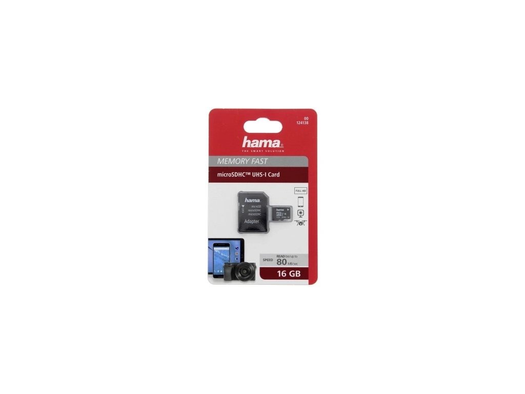 Hama microSDHC 16 GB, Class 10, UHS-I, 80 MB/s + SD adaptér. Rychlý přenos dat, ideální pro Full HD video a 3D.