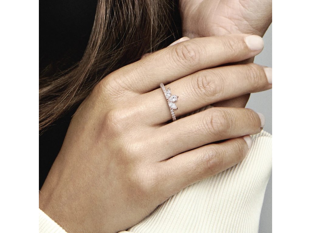 Prsten PANDORA Třpytivý herbářový shluk je elegantní doplněk, který oživí váš styl. Jeho jedinečný design inspirovaný květinami zaručuje, že nikdy nevyjde z módy. Prsten je vyroben z unikátní směsi kovů a je pozlacen 14karátovým růžovým zlatem, což mu dodává jemný a luxusní vzhled. Tři třpytivé kameny ve tvaru markýzy a hrušky, vyrobené z kubické zirkonie, jsou uspořádány do siluety květiny. Tento prsten je skvělým dárkem pro každou příležitost a hodí se pro každodenní nošení i speciální události.