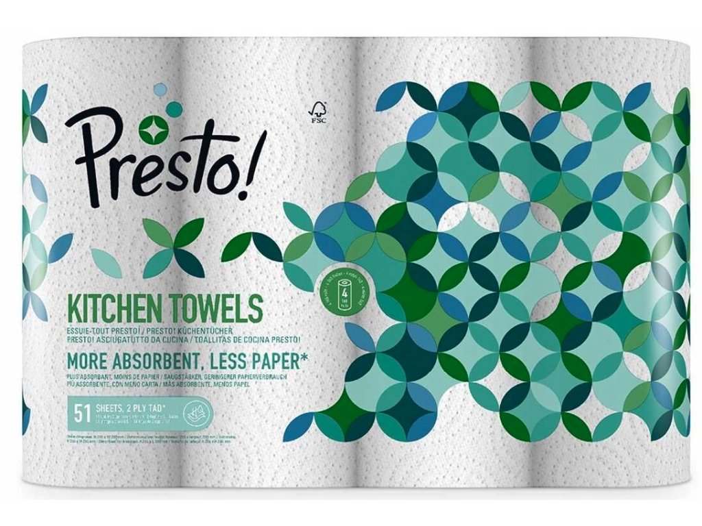 Tyto savé kuchyňské utěrky jsou ideální pro boj s odolným nepořádkem. Díky technologii TAD jsou až o 30 % savější než některé třívrstvé role, což znamená, že jich spotřebujete méně. Jsou velmi pevné a neobsahují chlór, protože jsou vyrobeny ze 100% certifikované celulózy. Utěrky Presto jsou bezpečné pro přímý styk s potravinami, což je činí všestranným pomocníkem v každé kuchyni.