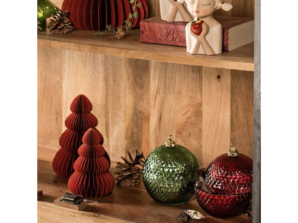 Dekorativní vánoční stromek využívá oblíbený efekt "honeycomb" (včelí plástev), který po rozložení vytváří bohatý prostorový objem. Stromek je vyroben z kombinace papíru a kartonu, což zajišťuje jeho lehkost a snadnou manipulaci při výzdobě interiéru. Díky kompaktním rozměrům se hodí jako ozdoba na sváteční tabuli, okenní parapet nebo poličku.