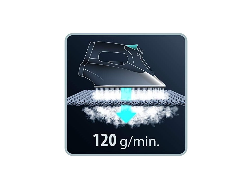 S příkonem 2400 W se žehlička rychle zahřeje a je připravena k použití. Silný parní ráz 120 g/min si poradí i s těmi nejodolnějšími záhyby, zatímco konstantní parní výkon 40 g/min zajistí plynulé žehlení.
