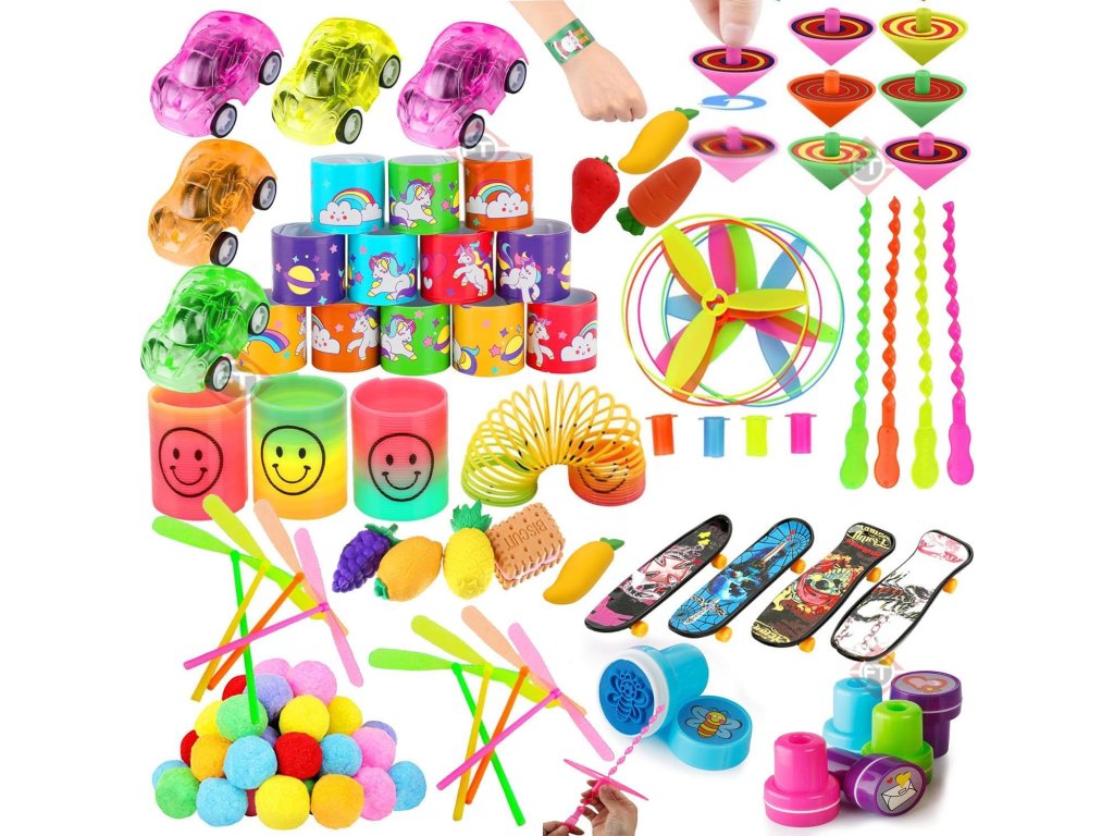 Sada Party Favors hraček je velký výběr malých dárků a hraček pro děti, ideální pro plnění party tašek, pinat, nebo jako odměny. Obsahuje mnoho různých druhů hraček pro kluky i holky.