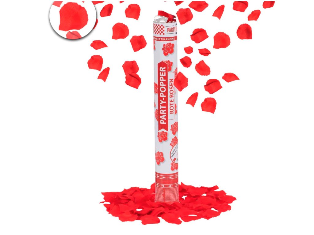 Party Popper 40 cm s červenými okvětními lístky růží je dekorativní prvek určený k vytvoření emotivní a vizuálně výrazné atmosféry. Při otočení mechanismu se uvolní sprcha lehkých papírových lístků, které připomenou symbol lásky, vášně a slavnostních okamžiků.