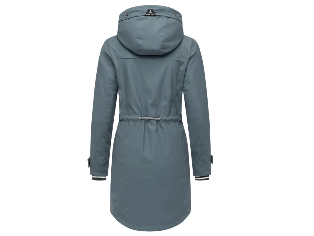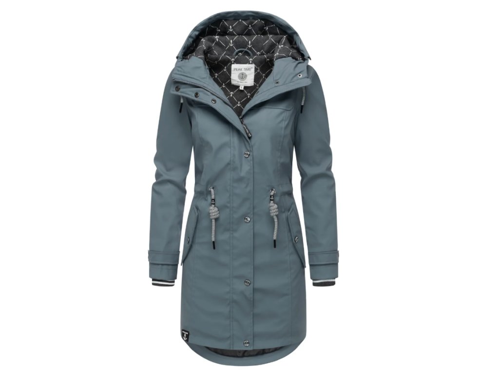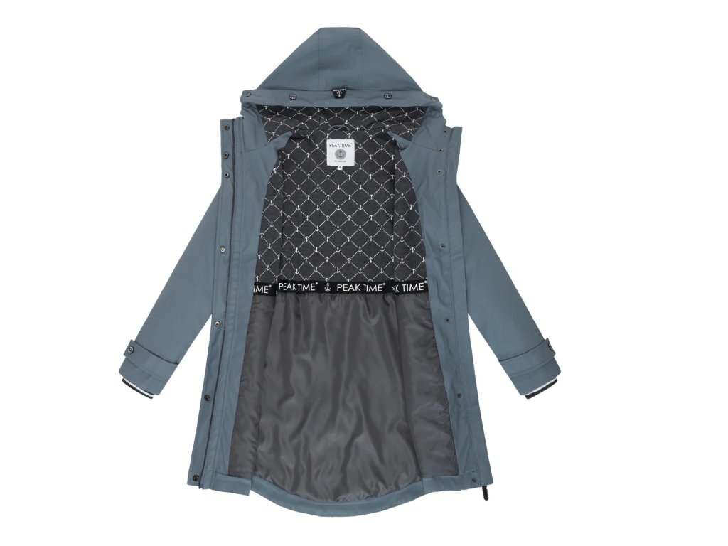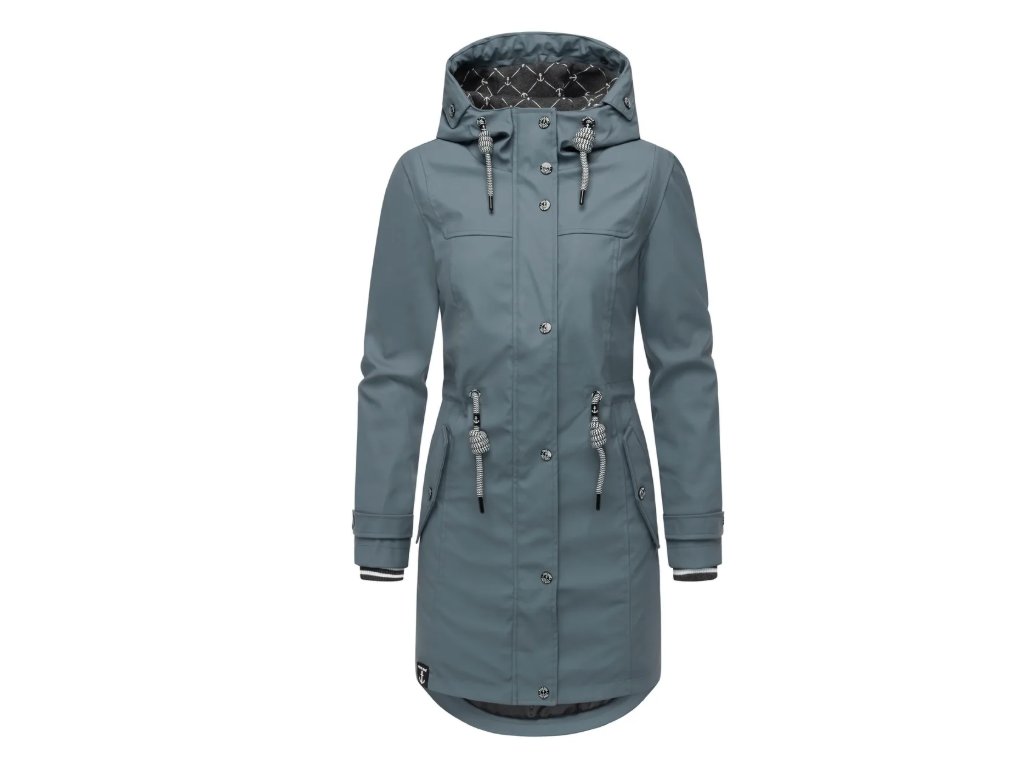 Bunda s délkou přibližně do poloviny stehen disponuje mírně projmutým střihem, který lze individuálně upravit pomocí stahovací šňůrky v pase. Zadní část je záměrně střižena o něco delší než přední, což zvyšuje komfort při nošení a lépe chrání před větrem. Svrchní vrstva z polyuretanu je zcela nepromokavá, zatímco ventilační otvory zajišťují potřebnou prodyšnost během aktivního pohybu. Vnitřní část je vybavena kombinovanou podšívkou s módním potiskem, která zasahuje až do kapuce. Praktické kapsy s druky a vysoko uzavíratelný límec s krytým zipem poskytují maximální ochranu i v silném dešti.