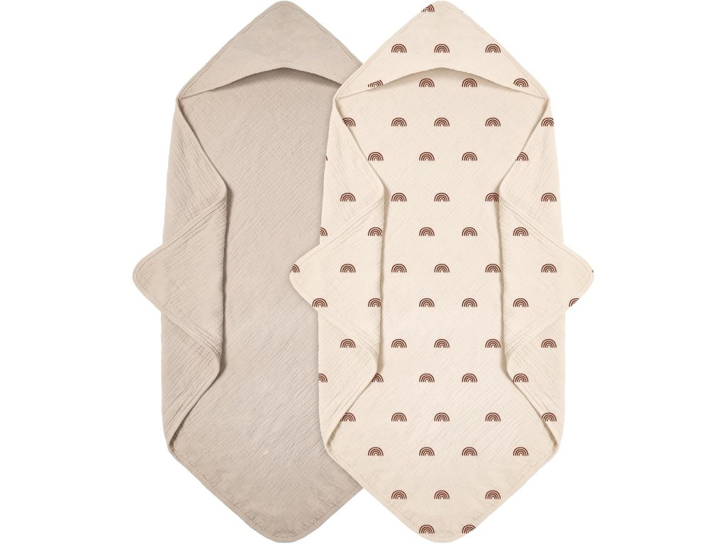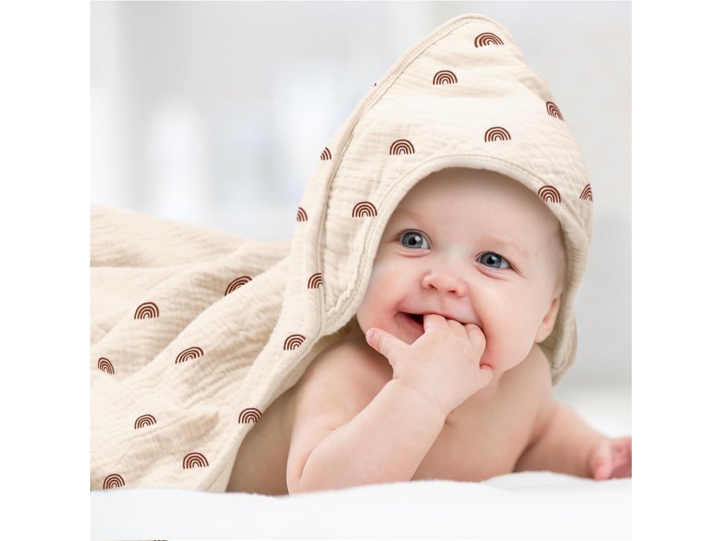 Díky velkorysému rozměru 76 x 76 cm jsou tyto osušky vhodné pro děti od narození až do 18 měsíců věku. Sada obsahuje jeden kus s hravým vzorem duhy a jeden kus v neutrální khaki barvě. Kromě primárního účelu po koupání lze tyto multifunkční osušky využít také jako lehkou deku, zavinovačku nebo praktickou podložku při přebalování. Kvalitní přírodní materiál je prodyšný a udržuje dítě v příjemném teple, aniž by docházelo k podráždění pokožky.