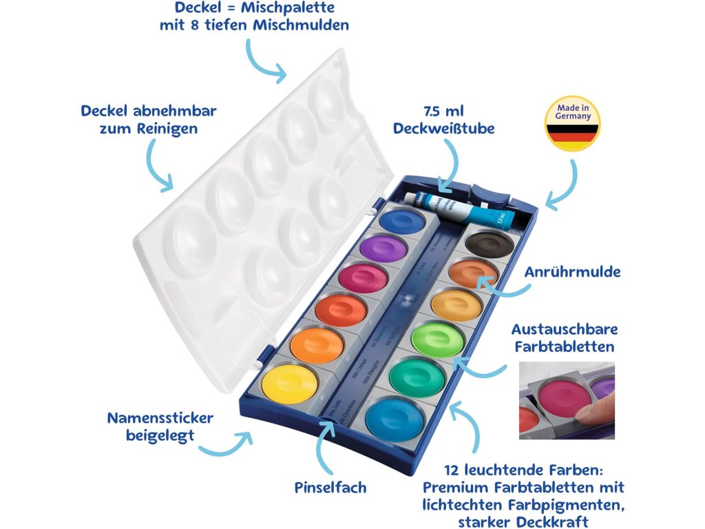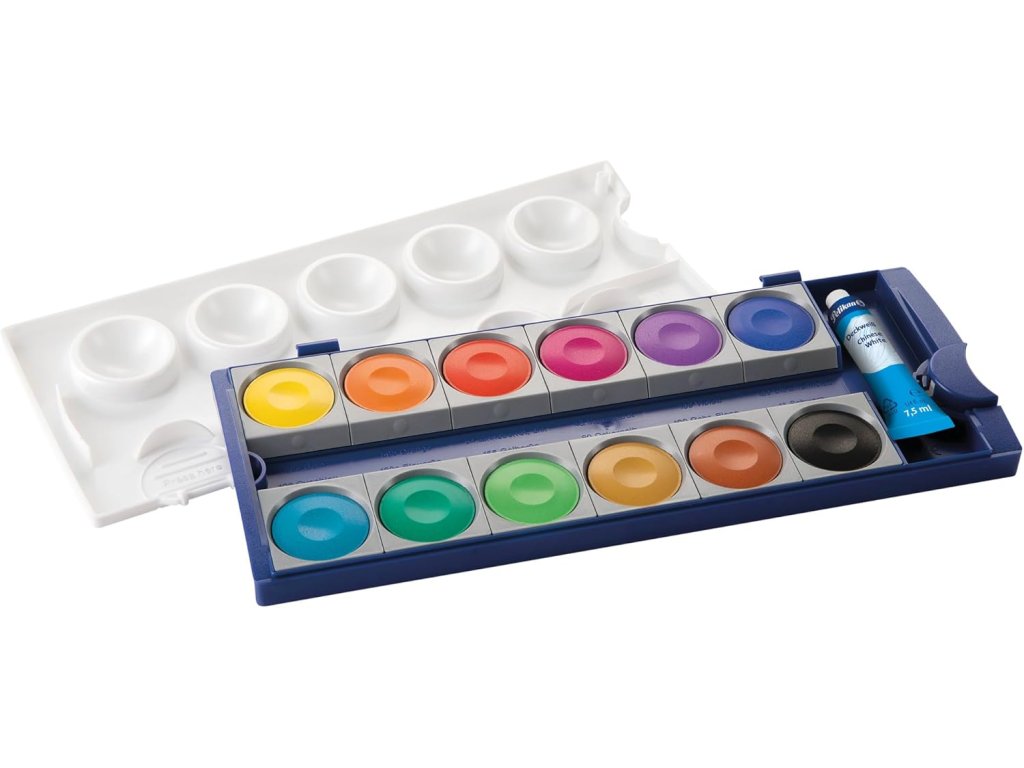 Pelikan sada akvarelových barev obsahuje 12 zářivých a světlostálých barev a navíc tubičku bílé barvy.