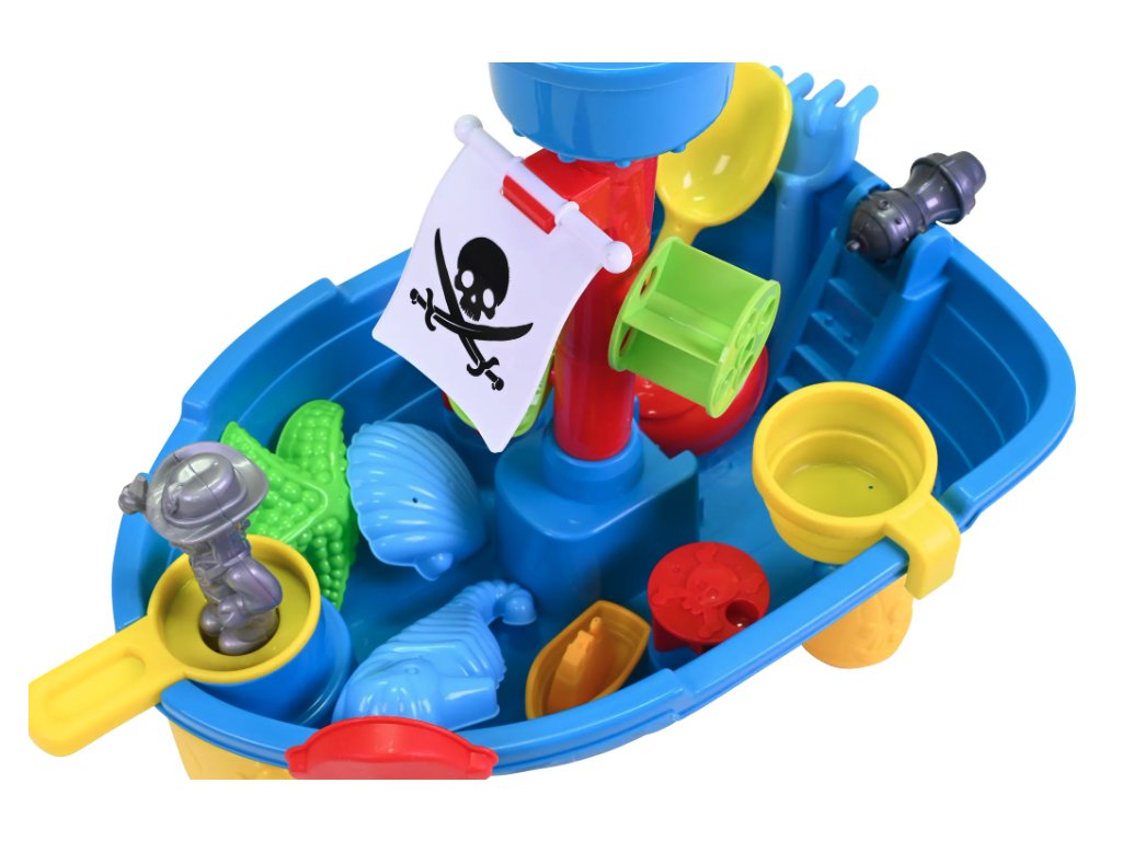 Tento pískový a vodní stůl v designu pirátské lodi je ideální pro nápadité dobrodružství a hodiny plné zábavy. Umožňuje dětem plavit lodě, stavět hrady z písku a objevovat svět kolem sebe. Hra s pískem a vodou hravou formou podporuje jemnou motoriku a smyslový rozvoj. Ve složeném stavu může stůl sloužit jako běžná pracovní deska, což z něj dělá všestranný a prostorově úsporný kus nábytku do dětského pokoje i na zahradu. Díky kompaktním rozměrům se vejde i do menších prostor.