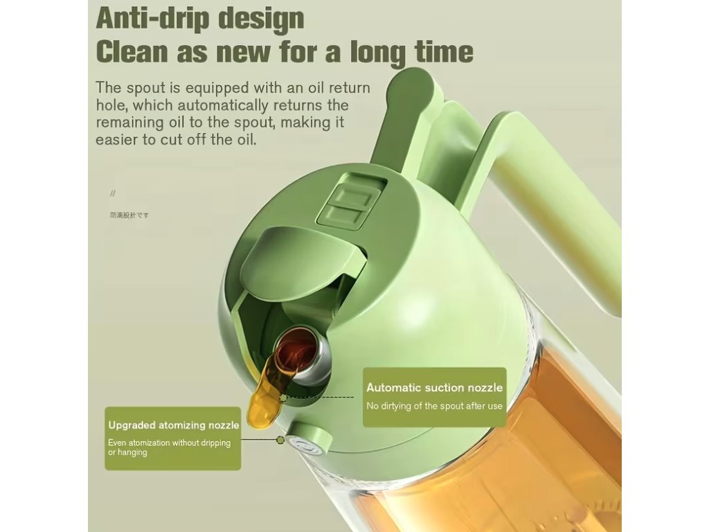 Černé víčko těsně přiléhá k nádobě, čímž zabraňuje úniku tekutin a chrání obsah před okolními vlivy. Používání rozprašovače pomáhá snížit spotřebu tuku při vaření, pečení i grilování, což ocení zejména uživatelé dbající na zdravý životní styl. Láhev se snadno plní i čistí, a díky svému ergonomickému tvaru se s ní velmi dobře manipuluje. Je nepostradatelným pomocníkem pro moderní vaření, který zjednodušuje přípravu jídel a přispívá k lepšímu kulinářskému výsledku.