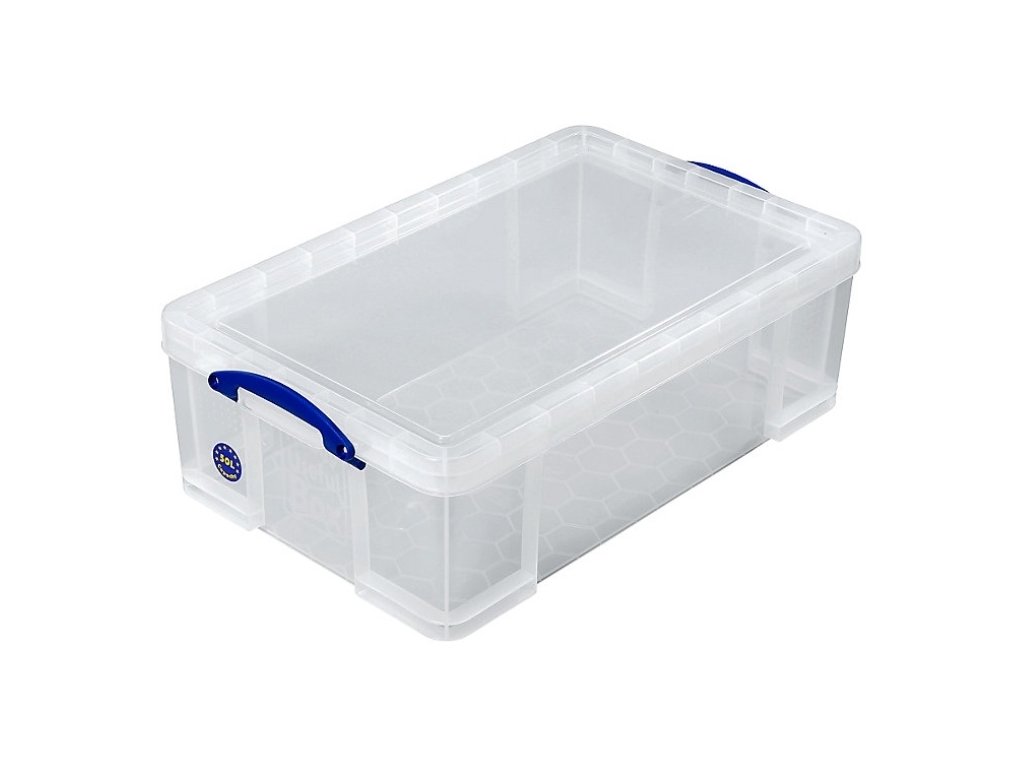 Transparentní úložný box REALLY USEFUL 50l s víkem a klipy pro přehledné skladování.