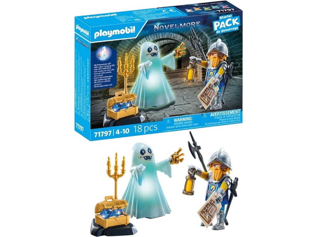 PLAYMOBIL Novelmore Hradní duch a rytíř (71797) je stavebnice pro děti od 4 let, která obsahuje figurku rytíře a hradního ducha s barvu měnící LED diodou svítící ve tmě. Součástí je také truhla s drahokamy a mapa pokladu. Hračka podporuje kreativitu a představivost. Vyžaduje jednu AAA 1.5V baterii.