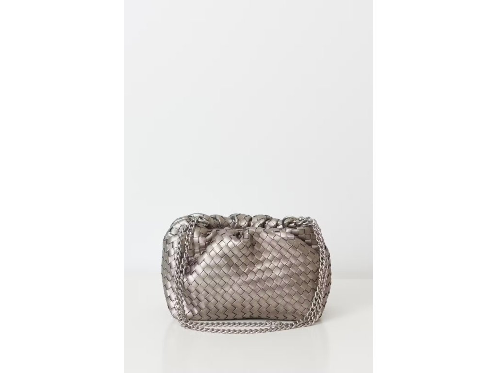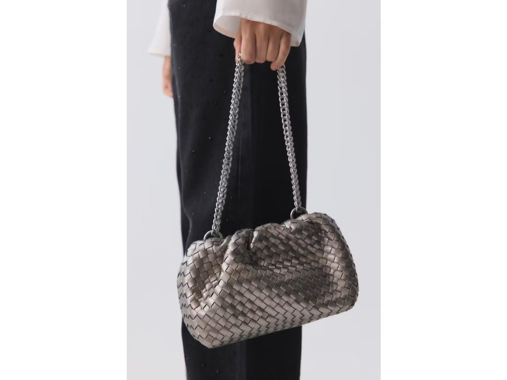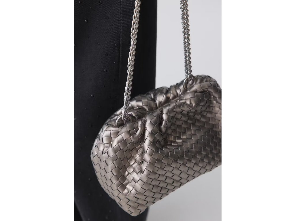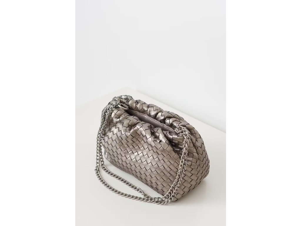Tato pletená taška má magnetické zapínání a stylový řetízkový popruh. Její design je moderní a hodí se pro různé příležitosti.