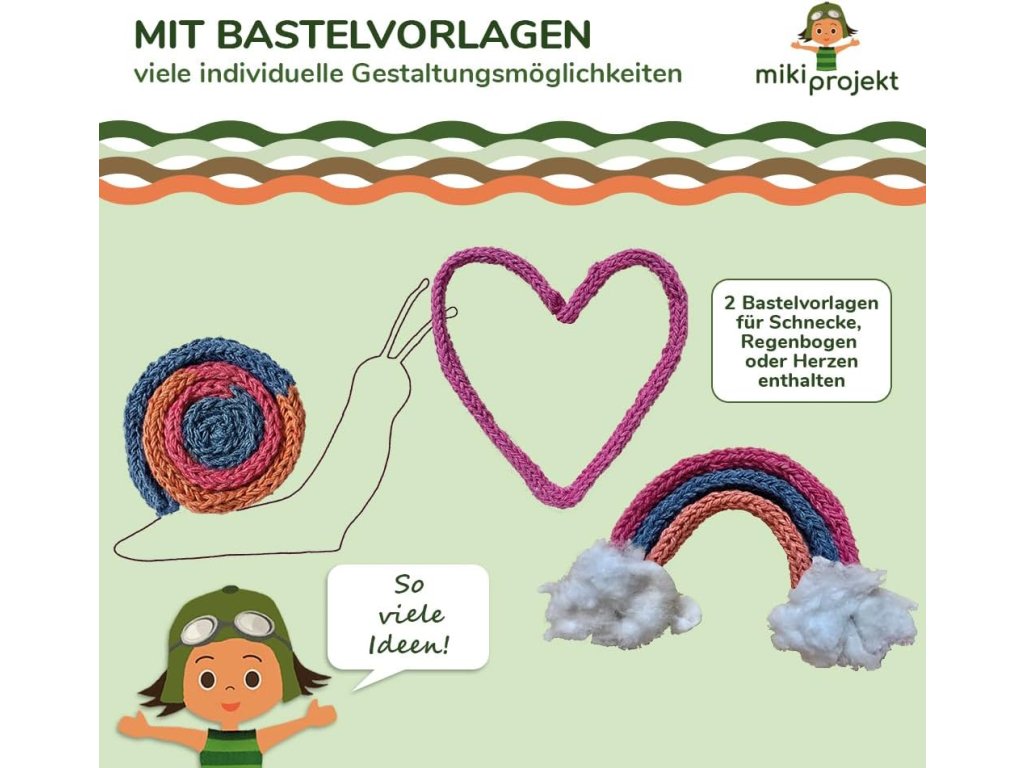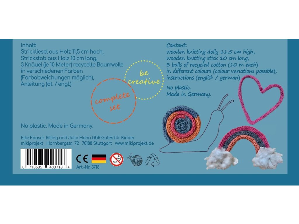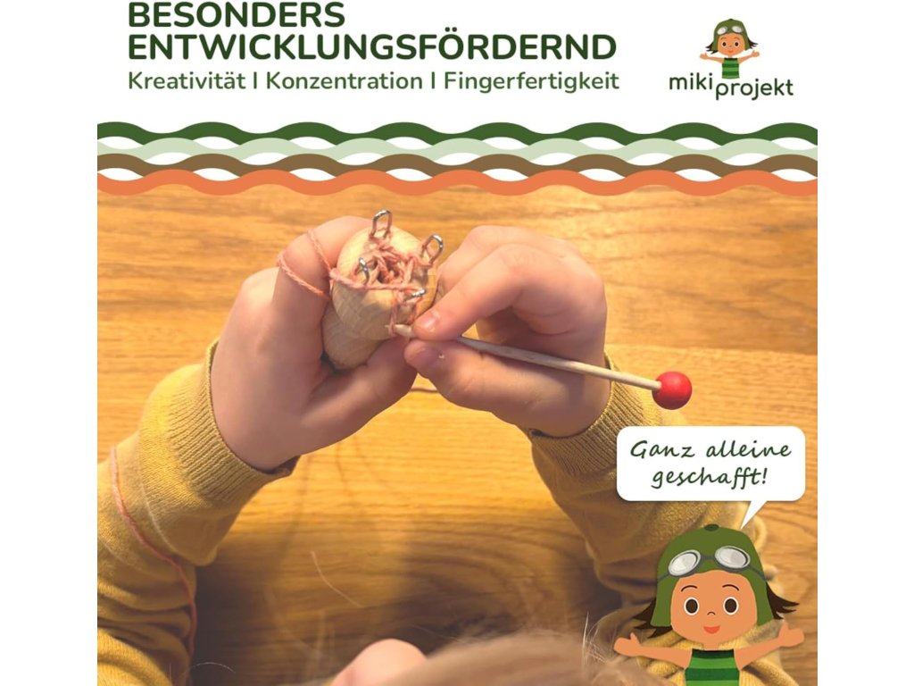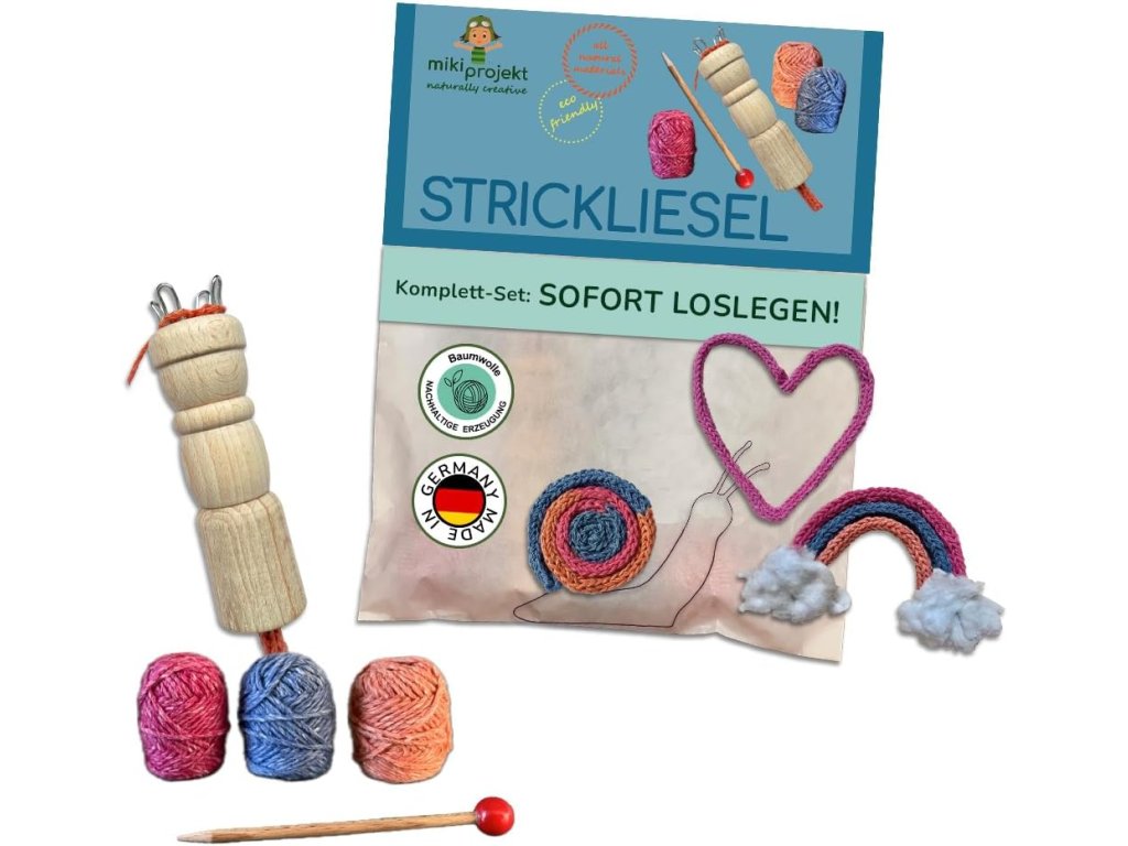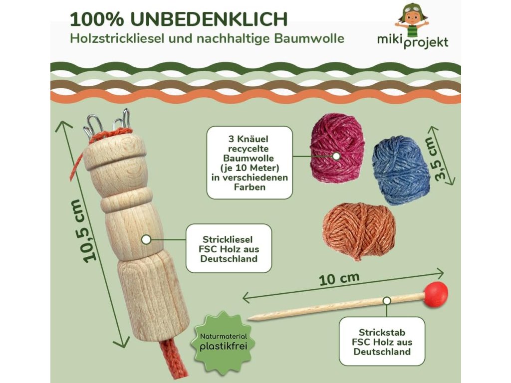 mikiprojekt® pletací panenky pro děti od 5 let. Udržitelná kompletní sada s pletací tyčkou, 3 barvami příze (3 x 10 m) a návodem. Pletení bez plastů, procvičuje motoriku a soustředění. Vyrobeno v Německu.