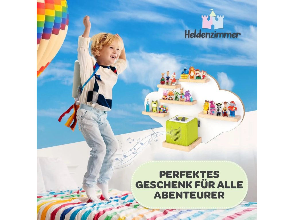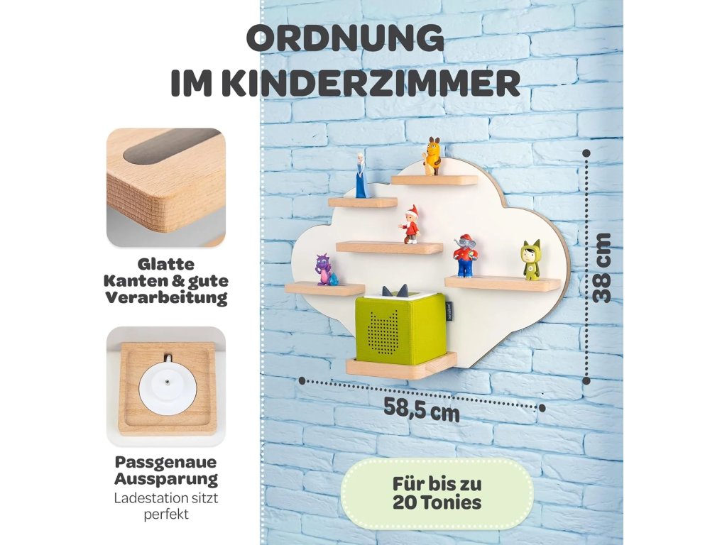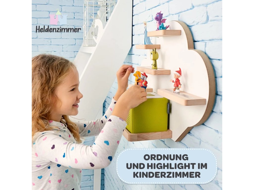 Tato roztomilá bílá police ve tvaru mraku je ideálním řešením pro přehledné a stylové uložení vaší sbírky figurek Tonies. Nabízí dostatek prostoru až pro 30 oblíbených postaviček. Díky svému designu skvěle doplní dětský pokoj a stane se jeho hravou dekorací. Montáž na zeď je velmi snadná a rychlá. Udržujte své Tonies uspořádané a vždy po ruce s touto praktickou a krásnou policí.