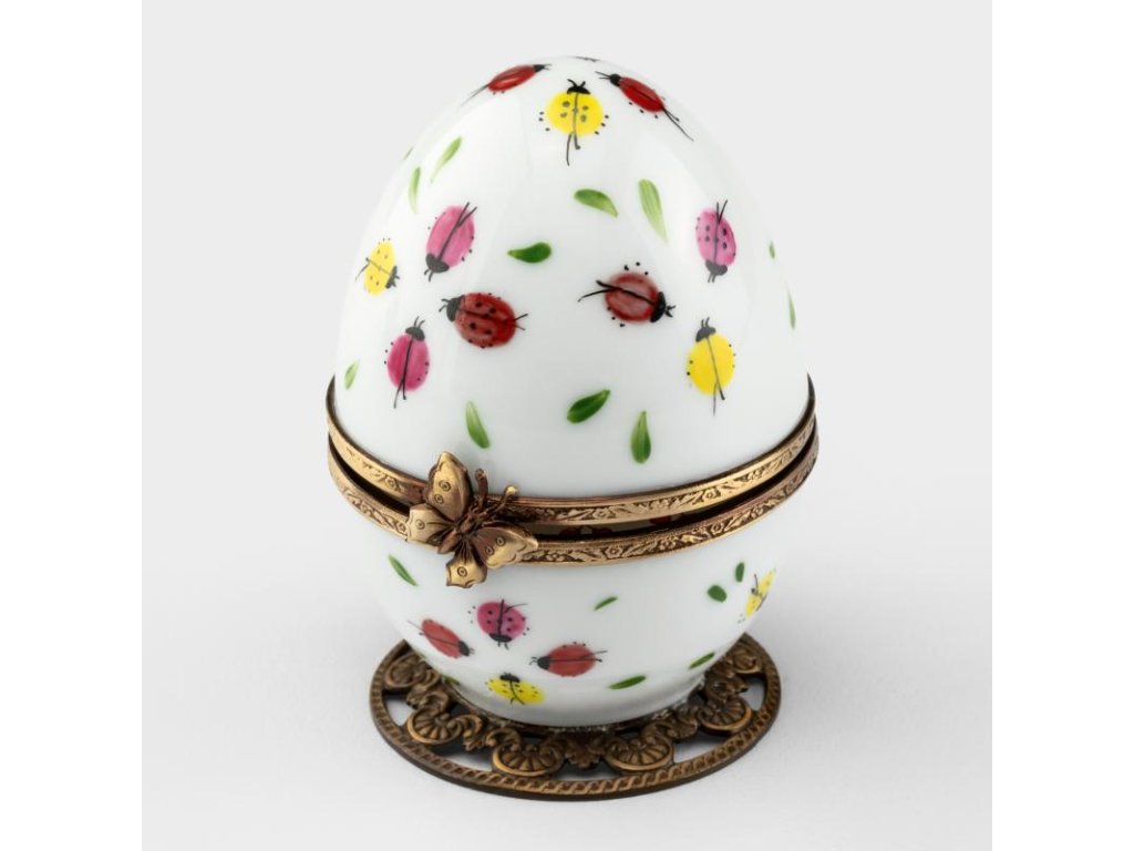 Uvnitř vajíčka se nachází detailně zpracovaná figurka slunéčka sedmitečného, která je usazena na staré frankové minci. K aktivaci hudby slouží masivní mosazný pružinový mechanismus, který se natahuje jednoduchým otočením ve směru hodinových ručiček. Celé dílo se vyznačuje mimořádnou péčí o detail, od ruční malby až po mechanické součásti. Vajíčko slouží jako elegantní interiérová dekorace nebo jako originální sběratelský předmět pro milovníky klasické hudby a uměleckého porcelánu.