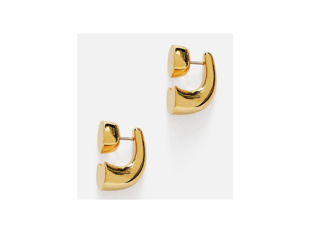 Konstrukce náušnic je navržena tak, aby po nasazení vytvářela dojem celistvého, prostorového objektu obepínajícího ušní lalůček. Zapínání je řešeno klasickou puzetou, která je diskrétně integrována do horní části šperku, což zajišťuje bezpečné a pohodlné nošení po celý den. Hladký povrch bez dalšího zdobení nechává plně vyniknout čistým liniím a hře světla na zlatavém povrchu.