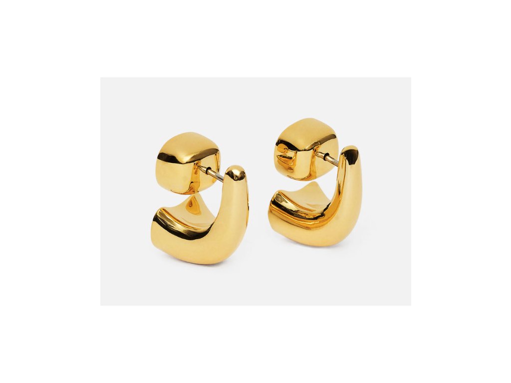 Tyto náušnice představují spojení minimalistického umění a moderního šperkařství. Jsou vyrobeny z kvalitního kovu s precizní pozlacenou povrchovou úpravou, která jim dodává vysoký lesk a luxusní vzhled. Design je postaven na zajímavém kontrastu dvou částí – horního zaobleného prvku a spodního masivnějšího segmentu ve tvaru prohnutého kužele.