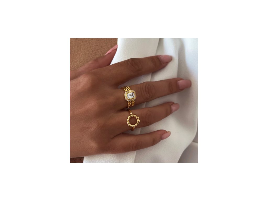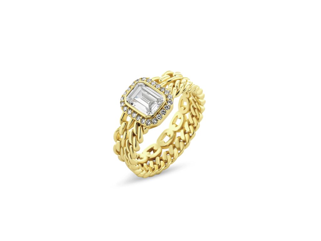 Elegantní prsten s ryzostí 925 je pozlacený 18karátovým žlutým zlatem a zdobený zirkony. Má velikost 50 a váží 4,80 gramů.