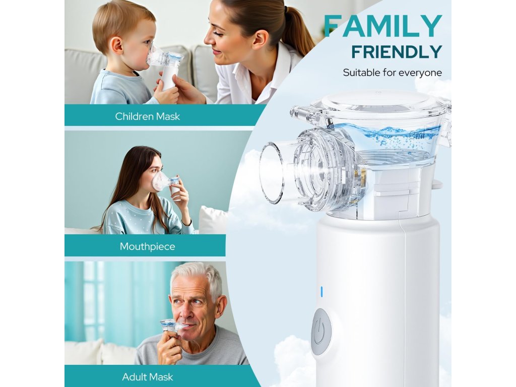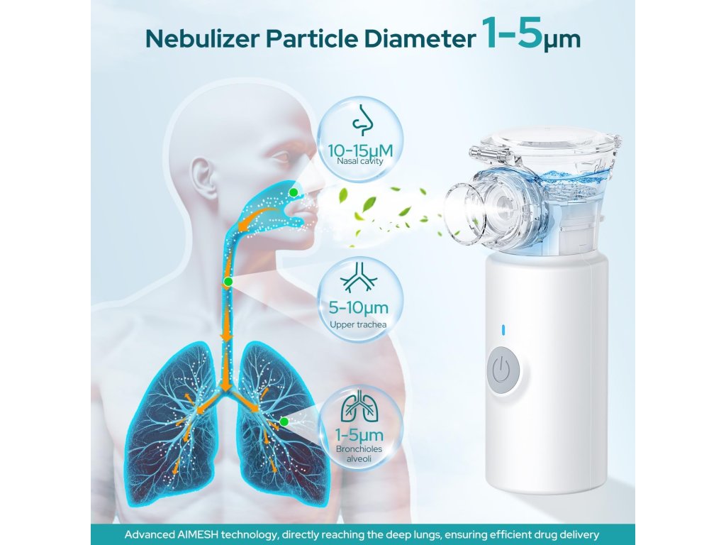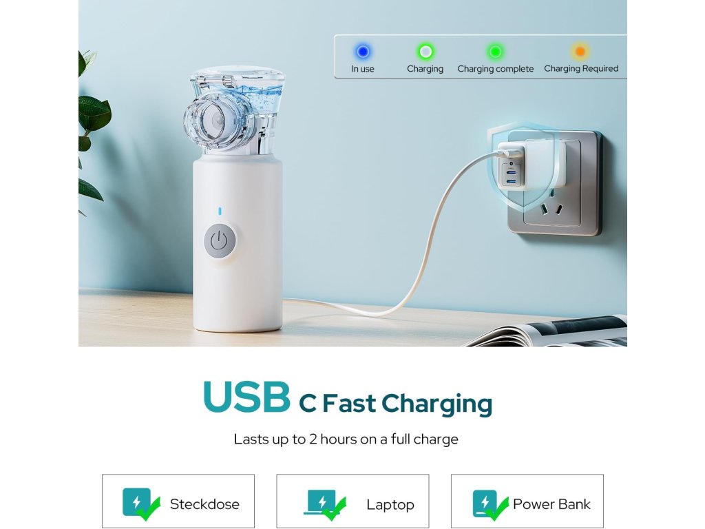Přístroj nabízí dvě nastavitelné úrovně intenzity rozprašování, což umožňuje přizpůsobit proces inhalace individuálním potřebám. Velkou výhodou je funkce automatického čištění, která pomáhá udržovat systém v dobrém stavu a prodlužuje životnost zařízení. Extrémně tichý provoz zaručuje, že inhalace nebude rušit okolí ani během noci, což ocení zejména rodiče malých dětí nebo citliví spáči. Napájení je řešeno vestavěnou baterií s pohodlným nabíjením přes USB kabel.