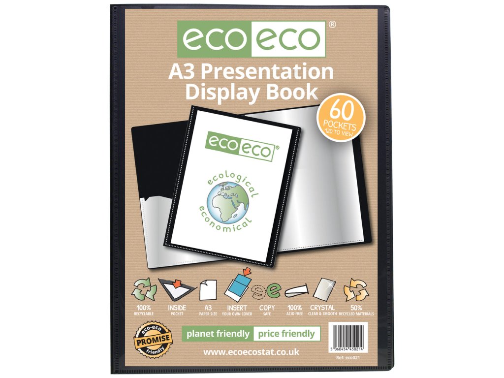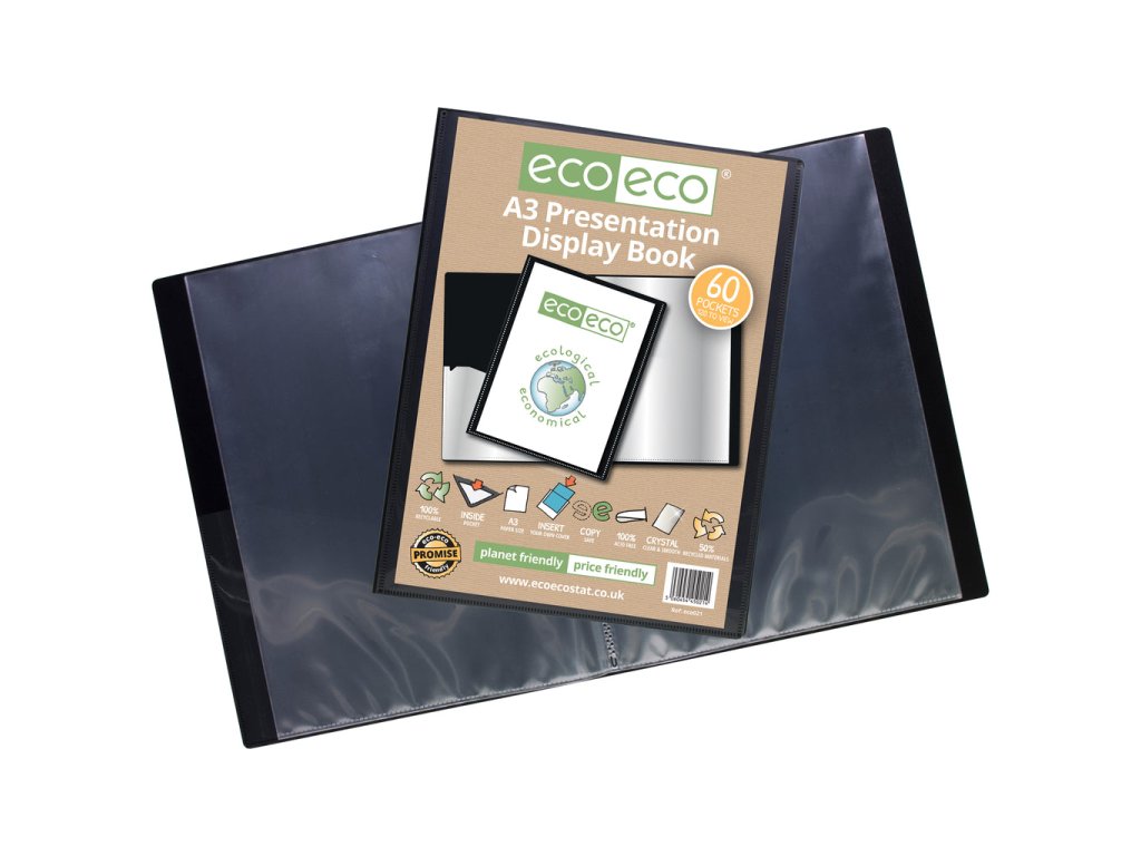 Profesionální a ekologická prezentační kniha formátu A3 s 60 kapsami pro optimální archivaci a prezentaci vašich dokumentů. Tato pevná černá kniha je vyrobena z 50 % recyklovaných materiálů a je plně 100% recyklovatelná, což z ní činí odpovědnou volbu pro vaši kancelář či domácnost.