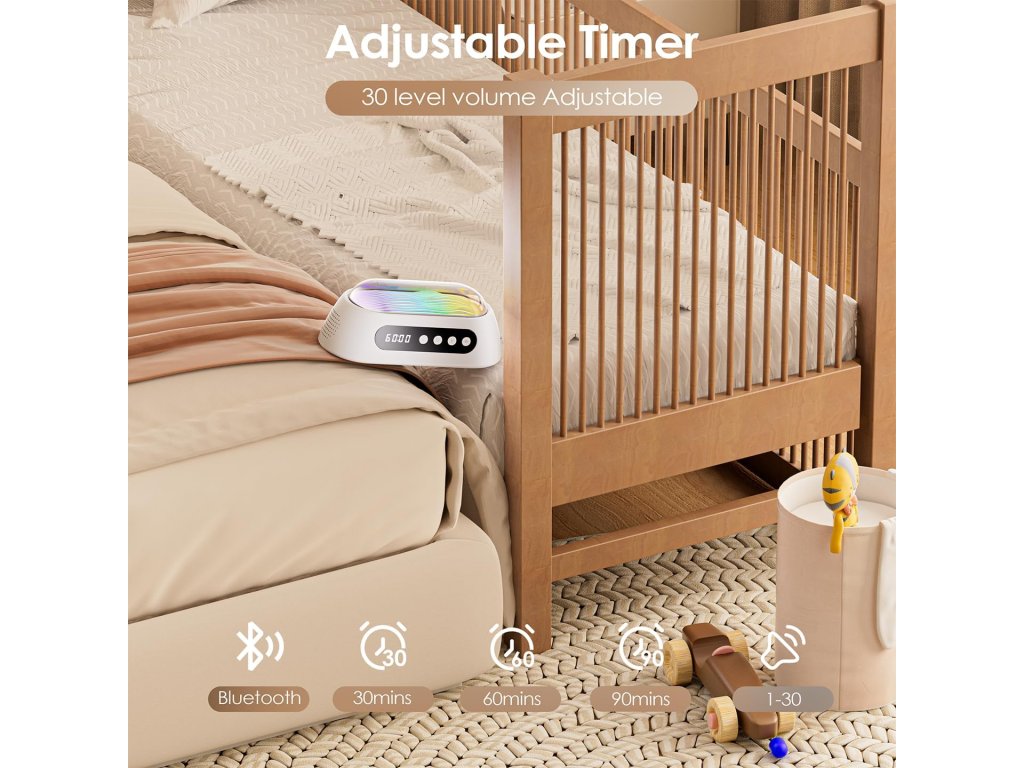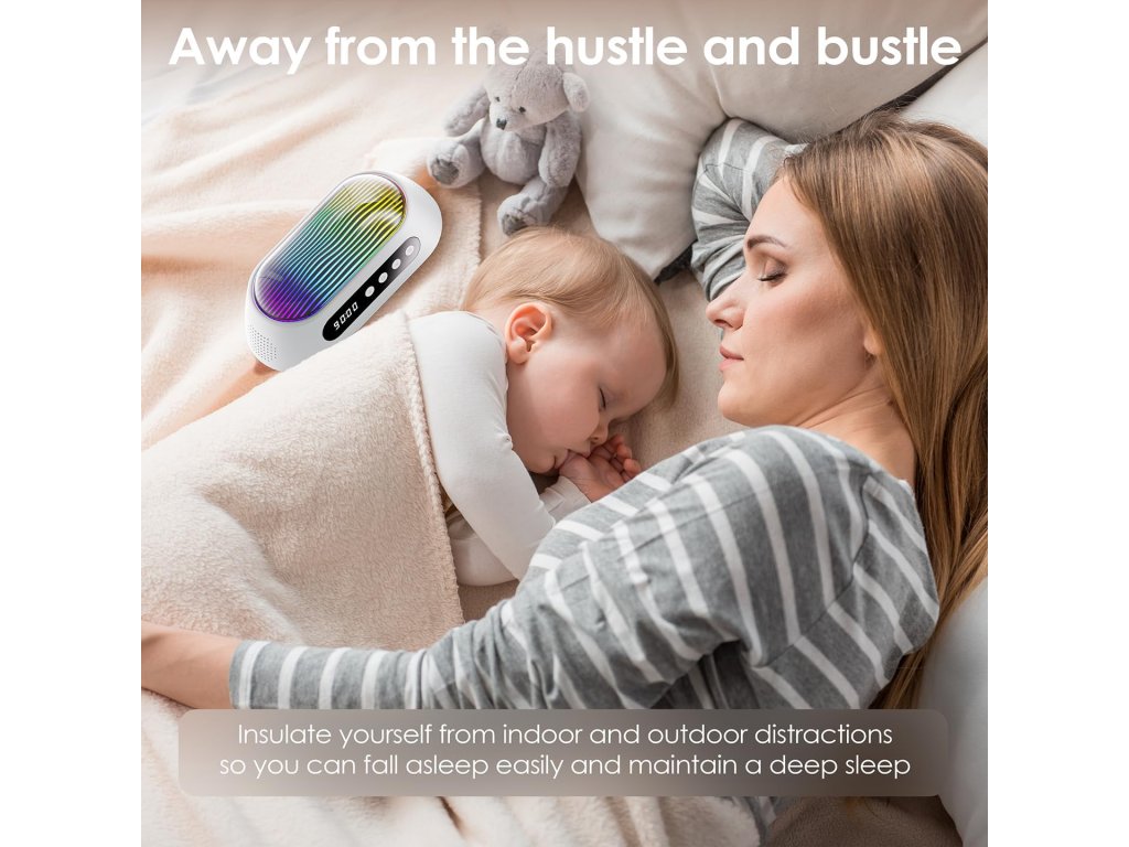 Vytvořte si ideální prostředí pro spánek s přístrojem s bílým šumem a duálními reproduktory. Nabízí 30 úrovní hlasitosti pro maskování rušivých zvuků a snadné usínání. Díky Bluetooth připojení můžete streamovat vlastní relaxační hudbu a kombinovat dva zdroje bílého šumu pro pohlcující zvukový zážitek. Praktický časovač spánku a vestavěná baterie s kapacitou 2500 mAh. Sedm barev nočního světla pro vytvoření uklidňující atmosféry. Jednoduché ovládání vhodné pro všechny věkové kategorie.