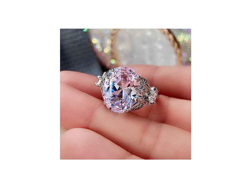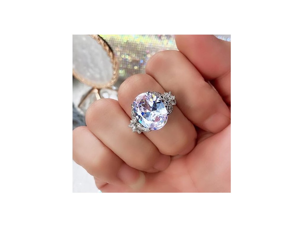 Výrazný prsten kombinuje eleganci velkého oválného brusu s jemným halo efektem, který opticky zvětšuje centrální kámen a dodává šperku vysoký lesk. Hlavním prvkem je kvalitní čirý zirkon o rozměrech 12 mm x 16 mm (AAA kvalita), který věrně simuluje vzhled diamantu. Tělo prstenu je vyrobeno z ekologické mědi s kvalitním pozlacením, což zajišťuje luxusní vzhled a dlouhou životnost.