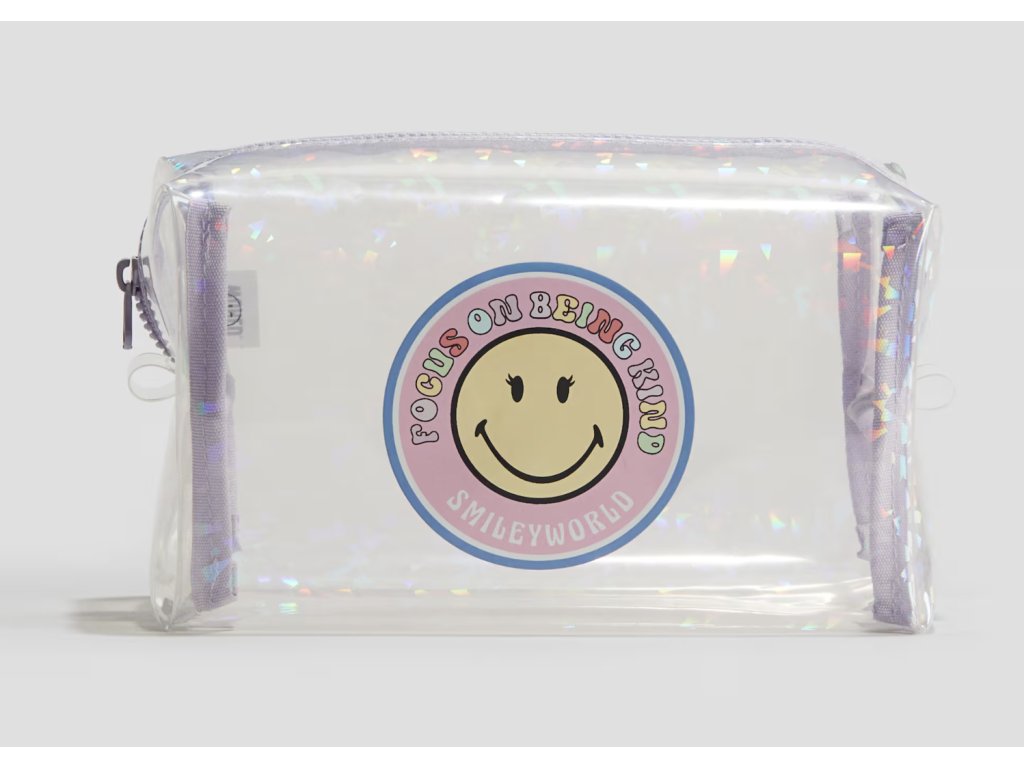 Díky průhlednému designu s holografickým efektem snadno uvidíte, co máte uvnitř, a nemusíte tak prohledávat obsah. Taška se pohodlně zavírá na zip, což zajišťuje, že se nic nevysype. Potisk SmileyWorld® dodává tašce hravý a pozitivní vzhled.
