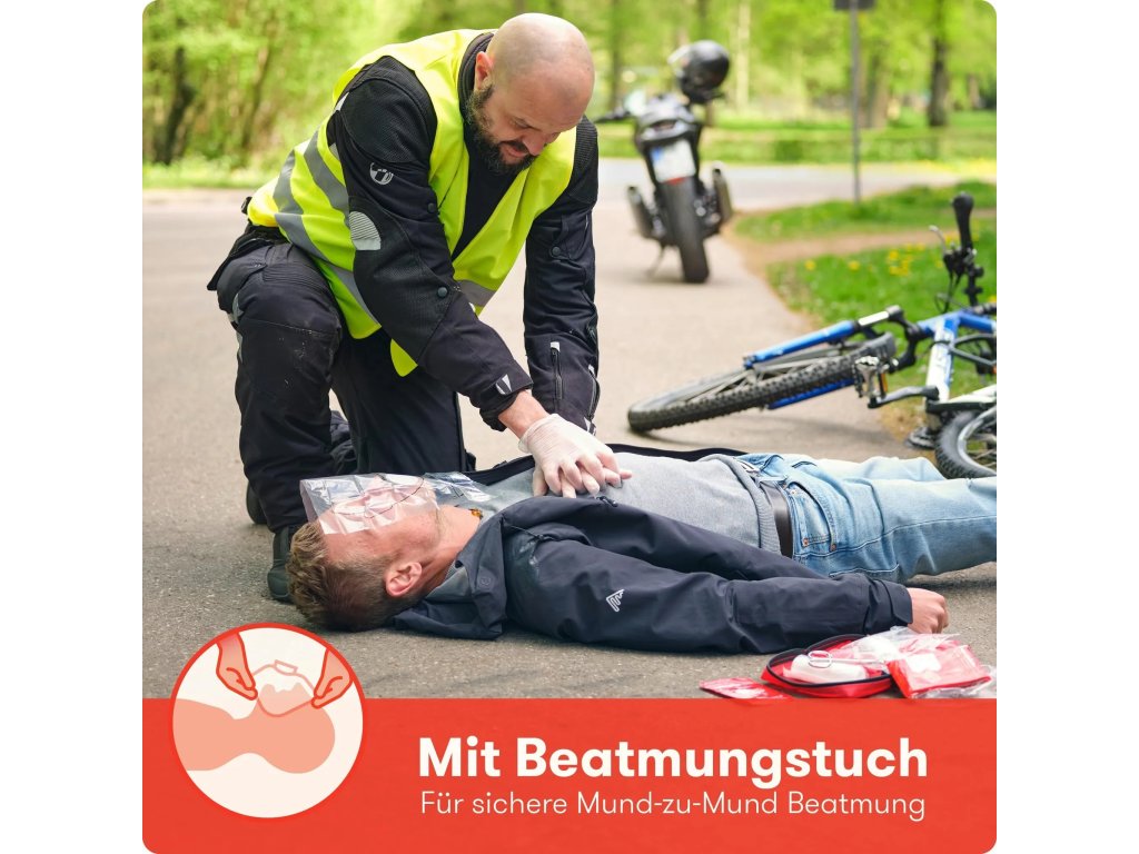 Lékárnička splňuje evropskou normu DIN 13167, takže je platná nejen v Česku, ale i v celé Evropě. Její obsah je přehledně rozdělen do fóliových sáčků, což usnadňuje rychlé nalezení potřebného vybavení v nouzové situaci. Součástí balení je také dýchací maska a přehledný návod, který vám připomene základní kroky pro záchranu života.