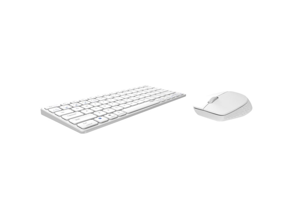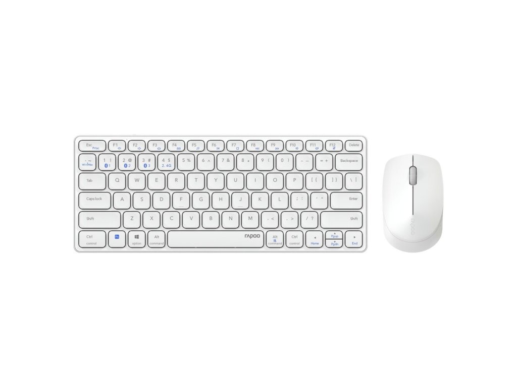 Bezdrátová sada klávesnice (QWERTY, hliníková slitina, vestavěná lithiová baterie) a myši (1300 DPI) Rapoo 9600M. Připojení Bluetooth 3.0/5.0 a 2.4 GHz, dosah 10 m, párování více zařízení. Bílá barva.