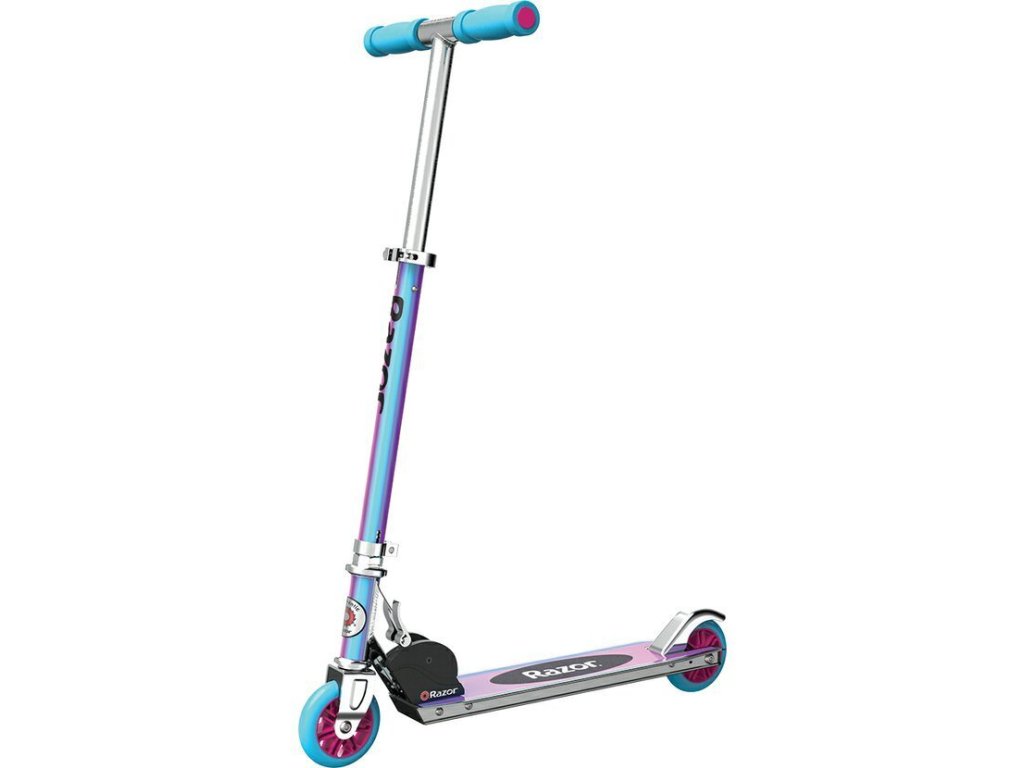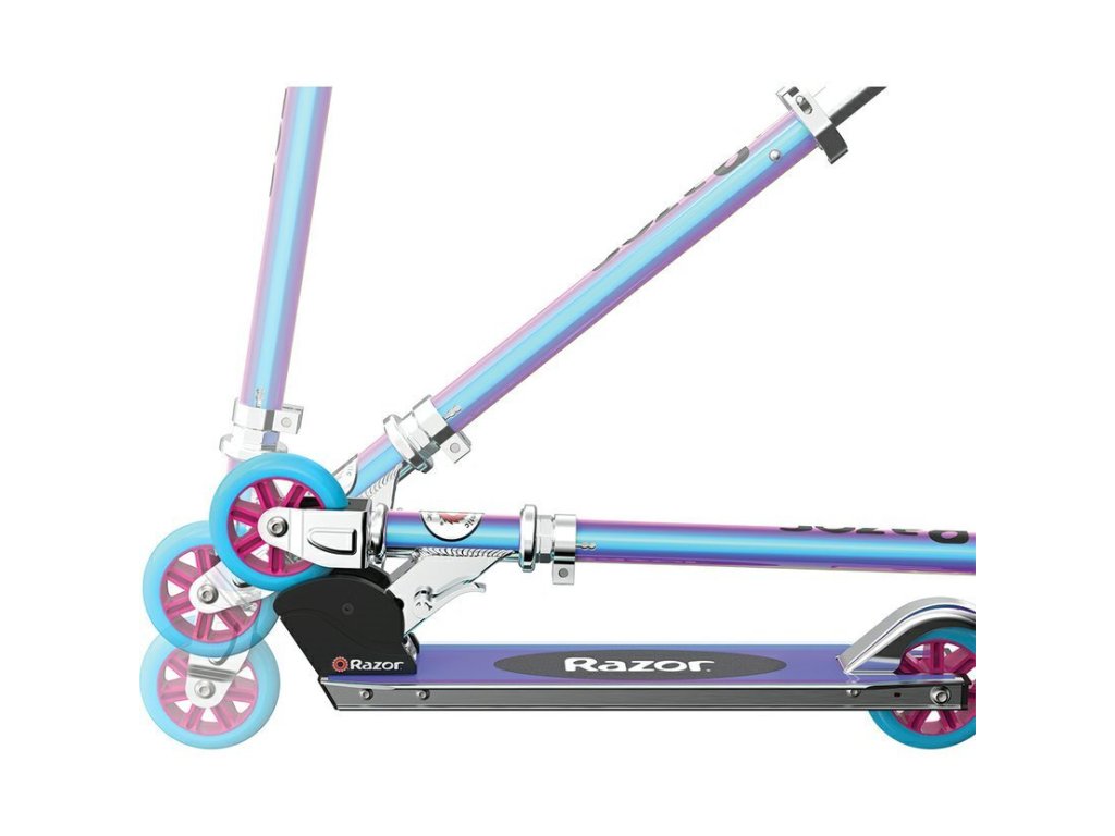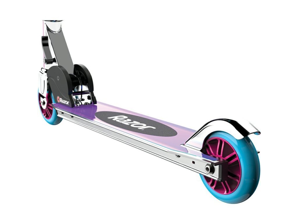 Stylová koloběžka Razor A Holographic ve speciální edici přináší ikonický design v neuvěřitelných barvách s holografickým efektem. Tato lehká a odolná koloběžka, vycházející z legendárního modelu z roku 2000, je ideálním společníkem pro každodenní dobrodružství. Díky snadnému skládacímu mechanismu a výškově nastavitelným řídítkům nabízí maximální pohodlí a styl pro každého mladého jezdce.