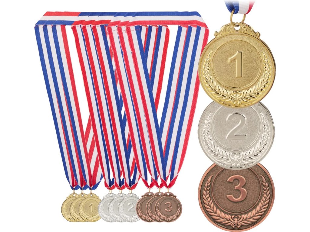 Tato sada obsahuje dvanáct medailí ve zlaté, stříbrné a bronzové barvě. Jsou ideální pro sportovní soutěže, dětské oslavy nebo jako ocenění pro malé vítěze.