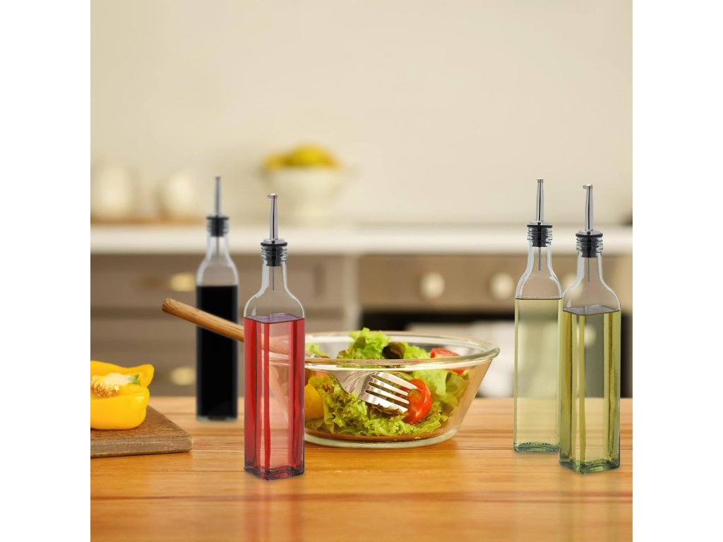 Každá láhev je vybavena speciální silikonovou nálevkou se zátkou, která zabraňuje nechtěnému odkapávání a zajišťuje čistou manipulaci při dochucování pokrmů. Objem 500 ml je ideální pro běžné používání, aniž by láhve zabíraly nadbytečné místo na pracovní ploše. Skleněné části jsou vhodné pro mytí v myčce na nádobí, což usnadňuje údržbu a hygienické znovunaplnění.