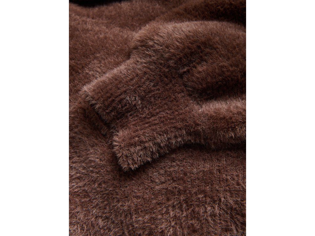 Tmavě hnědý svetr z jemného úpletu s chlupatým efektem nabízí příjemné teplo a stylový vzhled pro chladnější dny.