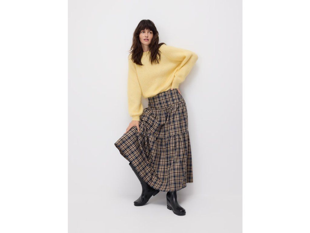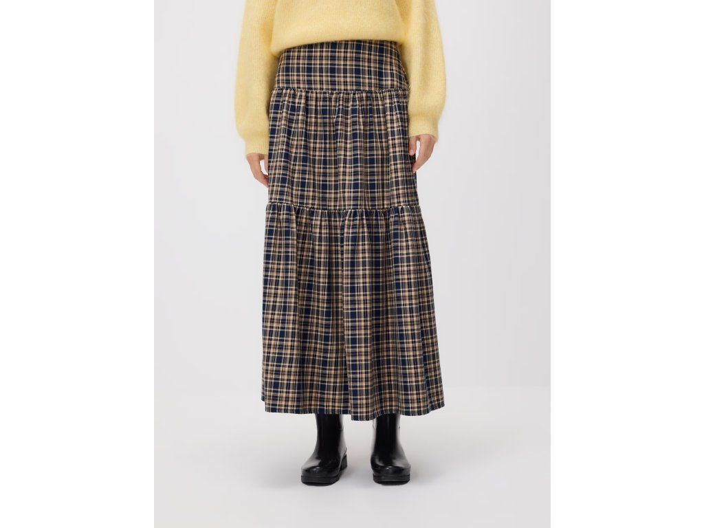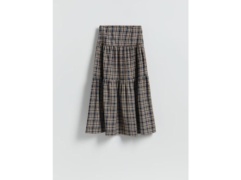 Vícebarevná sukně s drobným kostkovaným vzorem a volánovým lemem nabízí elegantní a vzdušný vzhled pro každodenní outfit.