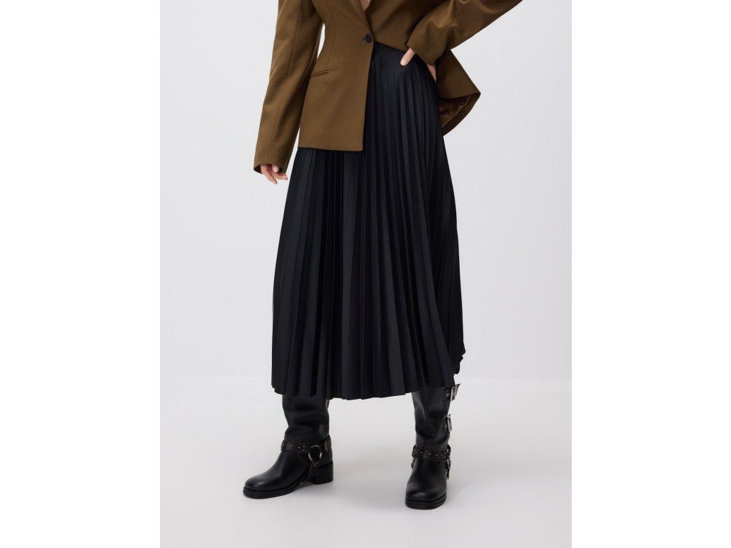 Černá sukně s celoplošným plisováním a elastickým pasem nabízí kombinaci pohodlí a elegantního vzhledu.
