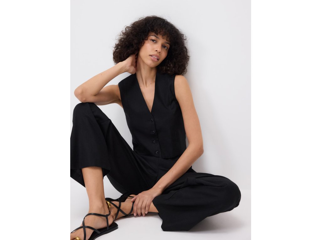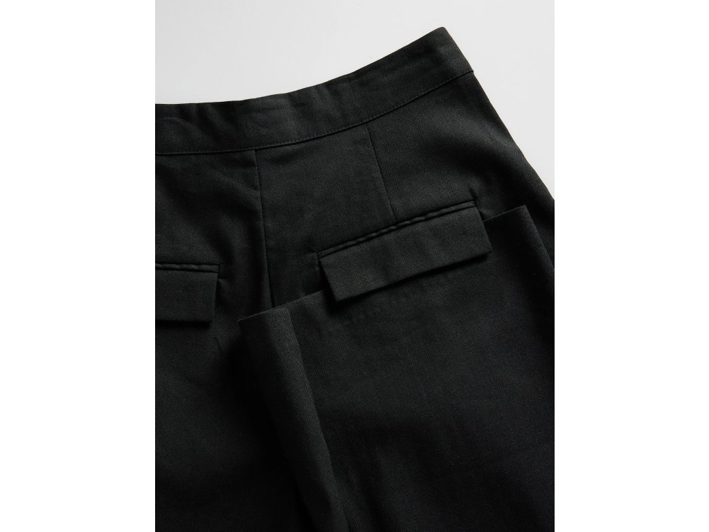 Na bocích se nachází dvě praktické kapsy, zatímco zadní kapsy jsou dekorativní (falešné). Černá barva dodává kalhotám nadčasový a univerzální vzhled, který se snadno kombinuje s košilemi, halenkami i jednoduchými topy.