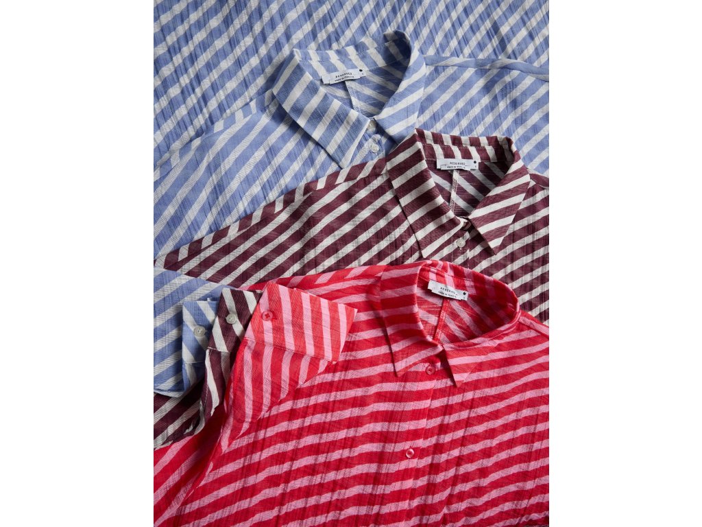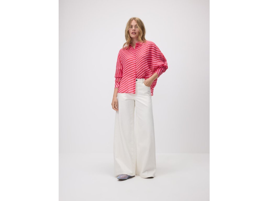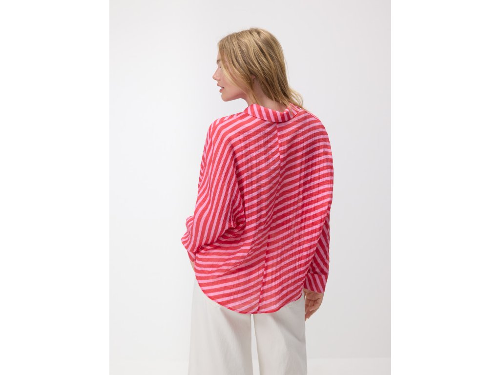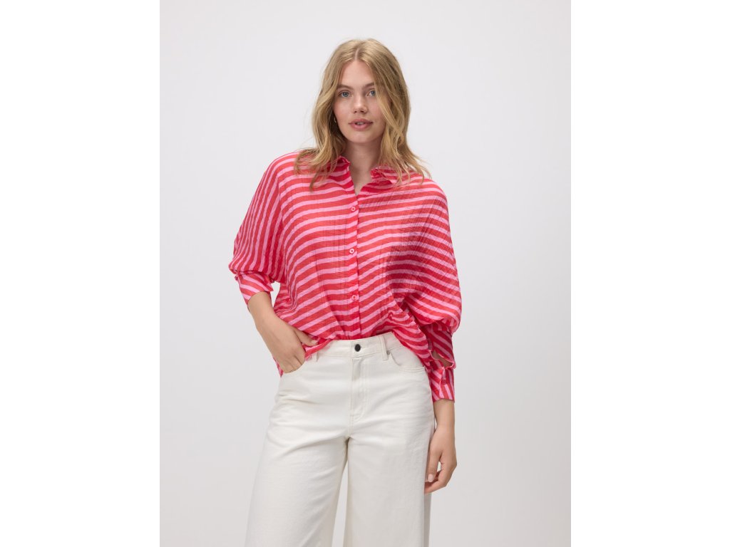 Výrazná fuchsiová barva s vzorem dodává košili moderní charakter a umožňuje ji kombinovat jak s elegantními kalhotami, tak s džínami nebo sukní.