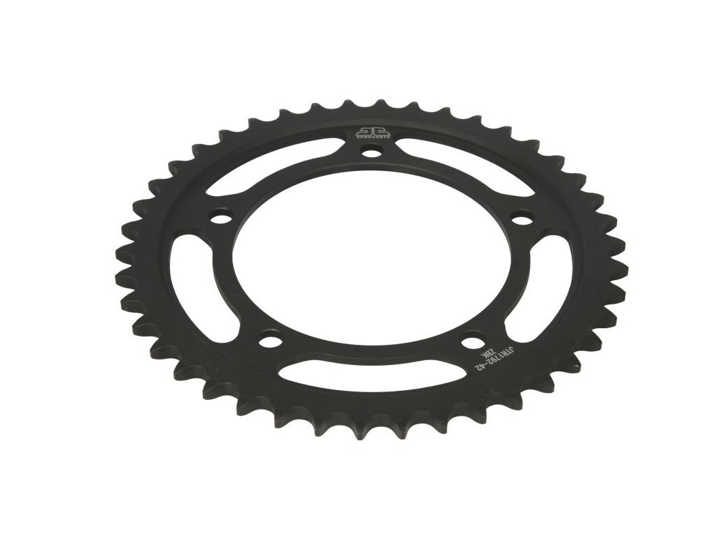 Řetězové kolo JT je zadní rozeta vyrobená z kvalitní oceli, určená pro motocykly. Má 42 zubů, je v černé barvě a je kompatibilní s řetězy typu 525.