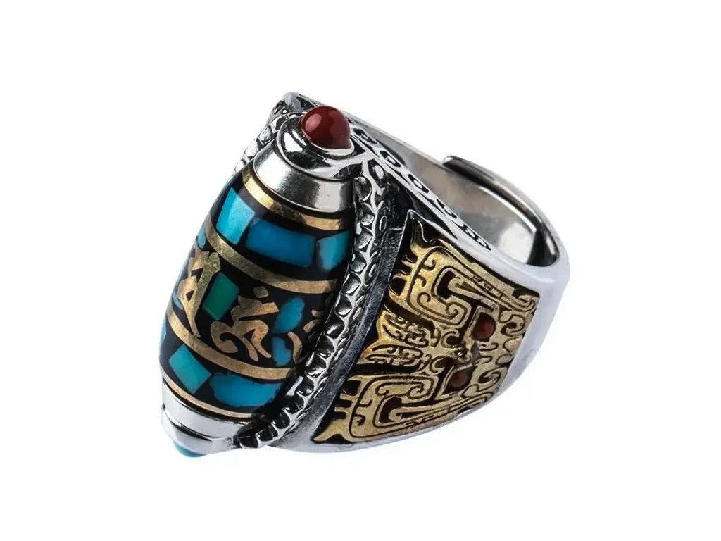 Tento prsten je vyroben z mědi a má motiv rotujících devítiokých nebeských korálků a šestipostarové mantry. Je nastavitelný a má zlatou a stříbrnou barvu.