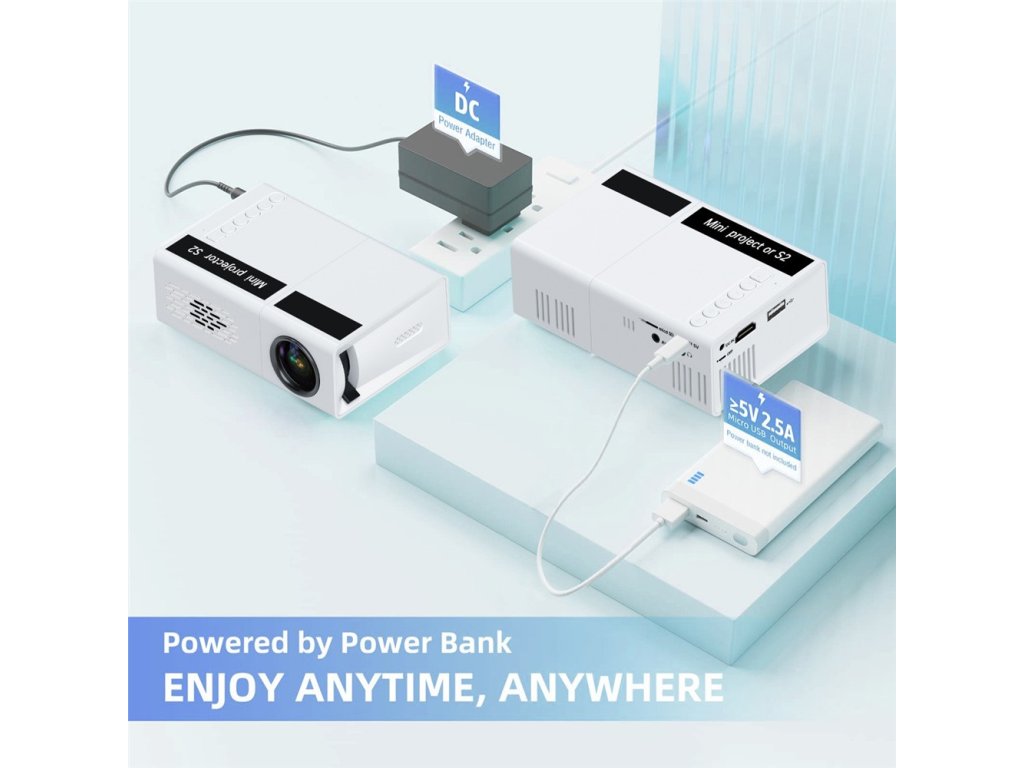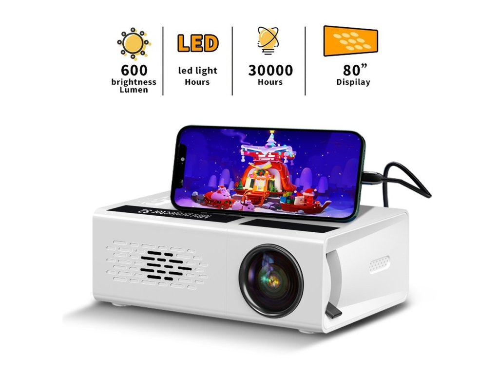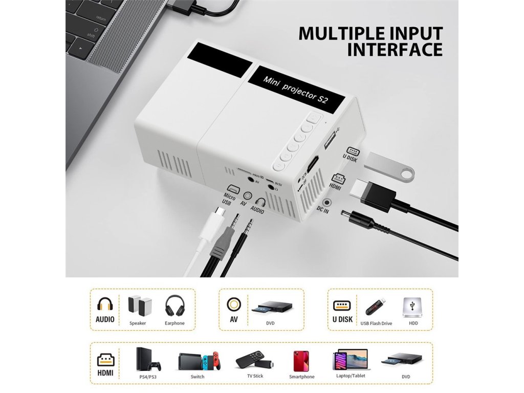 Mini projektor S2 je kompaktní a snadno přenosný mediální přehrávač který vám umožní vytvořit zážitek jako v kině kdekoli. Je ideální pro domácí kino rodinné filmové večery sledování sportovních událostí a videoher.