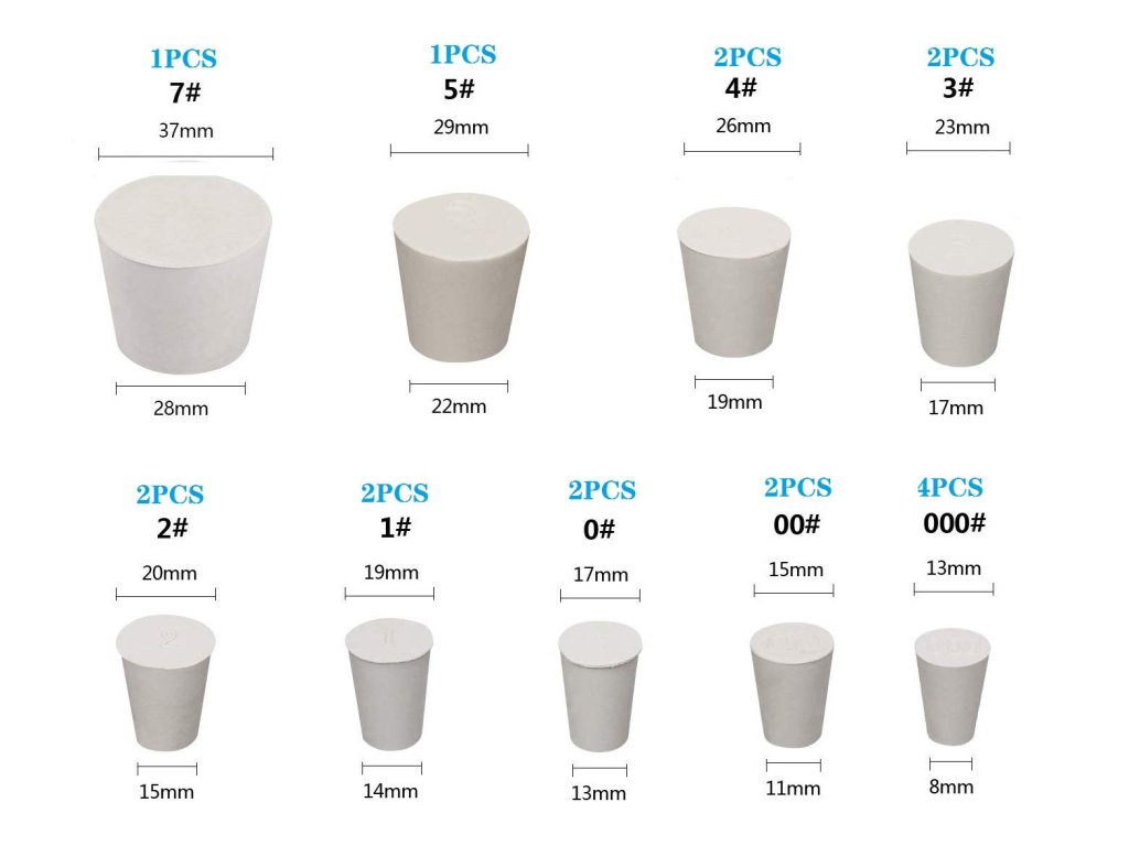Profesionální sada laboratorních zátek z plné bílé pryže od značky Heatigo obsahuje celkem 18 kusů v 9 různých velikostech (000# až 7#). Zátky mají kuželovitý tvar pro snadné a bezpečné těsnění skleněných i plastových nádob, jako jsou zkumavky, baňky nebo jiné laboratorní nádoby.